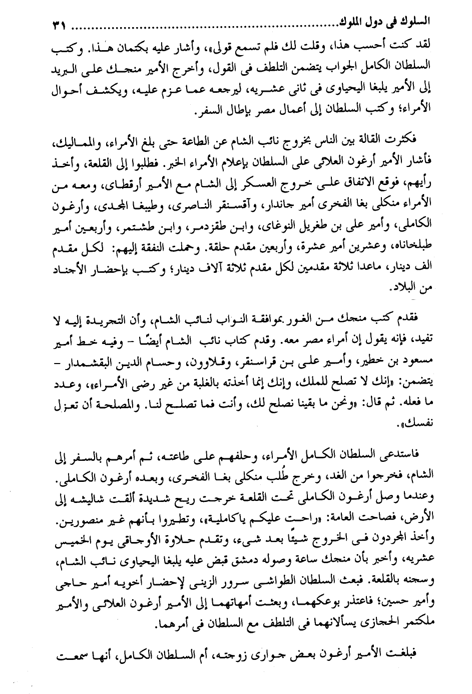 لقد كنت أَحسب هَذَا وَقلت لَك فَلم تسمع قولى وَأَشَارَ عَلَيْهِ بكتمان هَذَا. وَكتب الْكَامِل الْجَواب يتَضَمَّن التلطف فِي القَوْل وَأخرج الْأَمِير منجك على الْبَرِيد إِلَى الْأَمِير يلبغا اليحياوي فِي ثَانِي عشريه ليرجعه عَمَّا عزم عَلَيْهِ ويكشف أَحْوَال الْأُمَرَاء وَكتب السُّلْطَان إِلَى أَعمال مصر بإطال السّفر. فكثرت القالة بَين النَّاس بِخُرُوج نَائِب الشَّام عَن الطَّاعَة حَتَّى بلغ الْأُمَرَاء والمماليك فَأَشَارَ الْأَمِير أرغون العلائي على السُّلْطَان بإعلام الْأُمَرَاء الْخَبَر. فطلبوا إِلَى القلعة وَأخذ رَأْيهمْ فَوَقع الِاتِّفَاق على خُرُوج الْعَسْكَر إِلَى الشَّام مَعَ الْأَمِير أرقطاي وَمَعَهُ من الْأُمَرَاء منكلى بغا الفخري أَمِير جاندار وآقسنقر الناصري وطيبغا المجدي وأرغون الكاملي وأمير عَليّ بن طغريل النوغاي وَابْن طقزدمر وَابْن طشتمر وَأَرْبَعين أَمِير طبلخاناه وَعشْرين أَمِير عشرَة وَأَرْبَعين مقدم حَلقَة. وحملت النَّفَقَة إِلَيْهِم: لكل مقدم ألف دِينَار ماعدا ثَلَاثَة مقدمين لكل مقدم ثَلَاثَة آلَاف دِينَار وَكتب بإحضار الأجناد من الْبِلَاد فَقدم كتب منجك من الْغَوْر. بموافقة النواب لنائب الشَّام وَأَن التجريدة إِلَيْهِ لَا تفِيد فَأَنَّهُ يَقُول أَن أُمَرَاء مصر مَعَه. وَقدم كتاب نَائِب الشَّام أَيْضا - وَفِيه خطّ أَمِير مَسْعُود بن خطير وأمير عَليّ بن قراسنقر وقلاوون وحسام الدّين البقشمدار - يتَضَمَّن: أَنَّك لَا تصلح للْملك وَأَنَّك أَنما أَخَذته بالغلبة من غير رضى الْأُمَرَاء وَعدد مَا فعله. ثمَّ قَالَ: وَنحن مَا بَقينَا نصلح لَك وَأَنت فَمَا تصلح لنا. والمصلحة أَن تعزل نَفسك. فاستدعى السُّلْطَان الْكَامِل الْأُمَرَاء وحلفهم على طَاعَته ثمَّ أَمرهم بِالسَّفرِ إِلَى فَخَرجُوا من الْغَد وَخرج طلب منكلى بغا الفخري وَبعده أرغون الكاملي. وعندما وصل أرغون الكاملي تَحت القلعة خرجت ريح شَدِيدَة أَلْقَت شاليشه إِلَى الأَرْض فصاحت الْعَامَّة: راحت عَلَيْكُم ياكاملية وتطيروا بِأَنَّهُم غير منصورين. وَأخذ المجردون فِي الْخُرُوج شَيْئا بعد شَيْء وَتقدم حلاوة الأوجاقي يَوْم الْخَمِيس عشريه وَأخْبر بِأَن منجك سَاعَة وُصُوله دمشق قبض عَلَيْهِ يلبغا اليحياوي نَائِب الشَّام وسجنه بالقلعة. فَبعث السُّلْطَان الطواشي سرُور الزينى لإحضار أَخَوَيْهِ أَمِير حاجي وأمير حُسَيْن فَاعْتَذر بوعكهما وَبعثت أمهاتهما إِلَى الْأَمِير أرغون العلائي والأمير الْحِجَازِي يسالأنهما فِي التلطف مَعَ السُّلْطَان فِي أَمرهمَا. فبلغت الْأَمِير أرغون بعض جواري زَوجته أم السُّلْطَان الْكَامِل أَنَّهَا سَمِعت