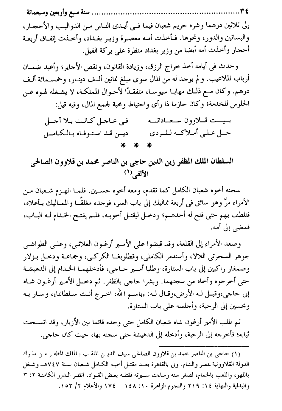 إِلَى ثَلَاثِينَ درهما وشره حَرِيم شعْبَان فِيمَا فِي أَيدي النَّاس من الدواليب والأحجار والبساتين والدور وَنَحْوهَا. فَأخذت أمه معصرة وَزِير بَغْدَاد وَأخذت إتفاق أَرْبَعَة أَحْجَار وأخدت أمه أَيْضا من وَزِير بَغْدَاد منظرة على بركَة الْفِيل. وَحدث فِي أَيَّامه أَخذ خراج الرزق وَزِيَادَة القانون وَنقص الأجاير وأعيد ضَمَان أَرْبَاب الملاعيب. وَلم يُوجد لَهُ من المَال سوى مبلغ ثَمَانِينَ ألف دِينَار وَخَمْسمِائة ألف دِرْهَم. وَكَانَ مَعَ ذَلِك مهاباً سيوساً متفقداً لأحوال المملكة لَا يشْغلهُ لهوه عَن الْجُلُوس للْخدمَة وَكَانَ حازماً ذَا رَأْي واحتياط ومحبة لجمع المَال وَفِيه قيل: بَيت قلاوون سعاداته فِي عَاجل كَانَت بِلَا آجل حل على أملاكه للردى دين قد اسْتَوْفَاهُ بالكامل السُّلْطَان الْملك المظفر زين الدّين حاجي بن النَّاصِر مُحَمَّد بن قلاوون الصَّالِحِي الألفي سجنه أَخُوهُ شعْبَان الْكَامِل كَمَا تقدم وَمَعَهُ أَخُوهُ حُسَيْن. فَلَمَّا انهزم شعْبَان من الْأُمَرَاء مر وَهُوَ سائق فِي أَرْبَعَة مماليك إِلَى بَاب السِّرّ فَوَجَدَهُ مغلقا والمماليك بأعلاه فتلطف بهم حَتَّى فتح لَهُ أحدهم وَدخل ليقْتل أَخَوَيْهِ فَلم يفتح الخدام لَهُ الْبَاب فَمضى إِلَى أمه. وَصعد الْأُمَرَاء إِلَى القلعة وَقد قبضوا على الْأَمِير أرغون العلائي وعَلى الطواشي جَوْهَر السحرتى اللالا وأسندمر الكاملي وقطلوبغا الكركى وَجَمَاعَة وَدخل بزلار وصمغار راكبين إِلَى بَاب الستارة وطلبا أَمِير حاجي فادخلهما الخدام إِلَى الدهيشة حَتَّى أَخْرجُوهُ وأخاه من سجنهما. وبشرا حاجي بالظفر. ثمَّ دخل الْأَمِير أرغون شاه إِلَى حاجي وَقبل لَهُ الأَرْض وَقَالَ لَهُ: باسم الله اخْرُج أَنْت سلطاننا وَسَار بِهِ وبحسين إِلَى الرحبة وَأَجْلسهُ على بَاب الستارة. ثمَّ طلب الْأَمِير أرغون شاه شعْبَان الْكَامِل حَتَّى وَحده قَائِما بَين الأزيار وَقد اتسخت ثِيَابه فَأخْرجهُ إِلَى الرحبة وَأدْخلهُ إِلَى الدهيشة حَتَّى سجنه بهَا حَيْثُ كَانَ حاجي.