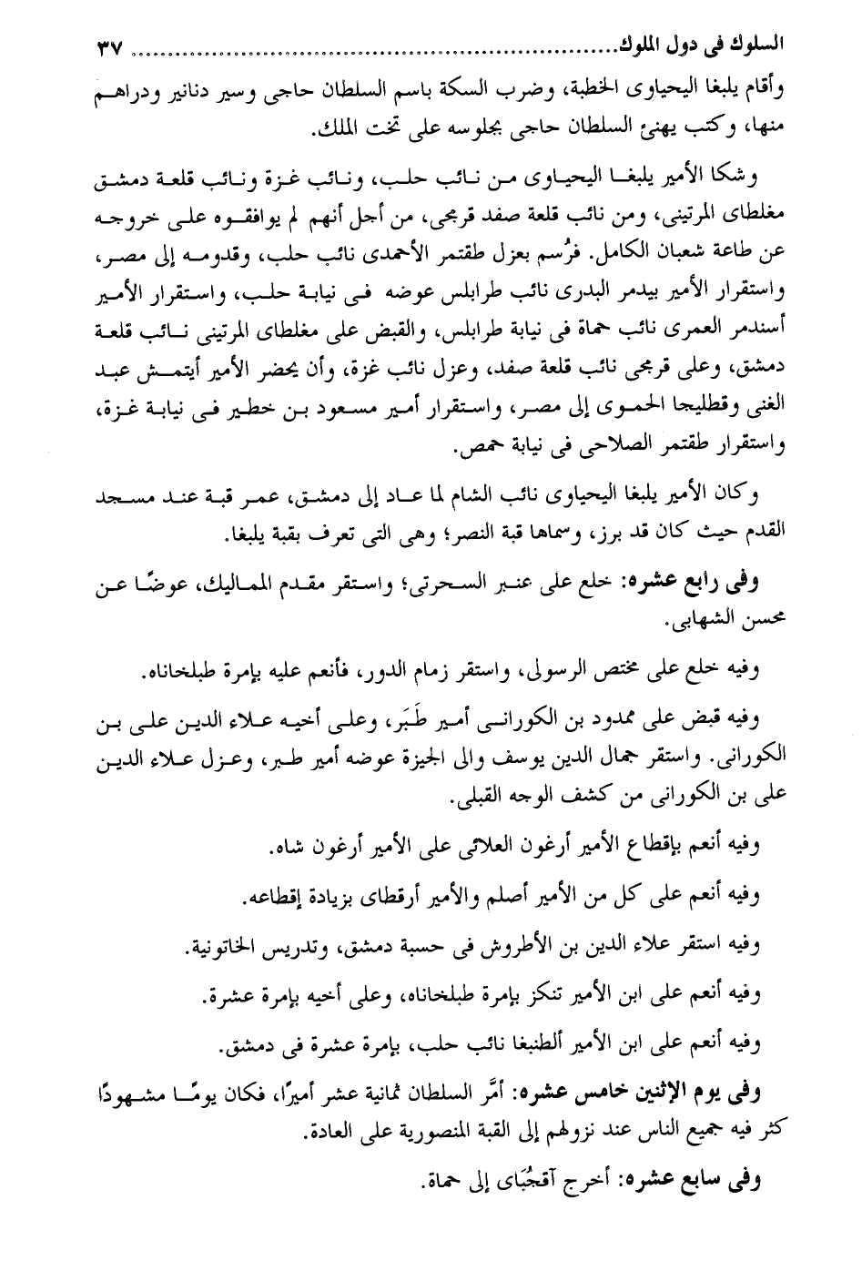 وَأقَام يلبغا اليحياوي الْخطْبَة وَضرب السِّكَّة باسم السُّلْطَان حاجي وسير دَنَانِير ودراهم مِنْهَا وَكتب يهنئ السُّلْطَان حاجي بجلوسه على تخت الْملك. وشكا الْأَمِير يلبغا اليحياوي من نَائِب حلب ونائب غَزَّة ونائب قلعة دمشق مغلطاي المرتيني وَمن نَائِب قلعه صفد قرمجي من أجل أَنهم لم يوافقوه على خُرُوجه فِي طَاعَة شعْبَان الْكَامِل. فرسم بعزل طقتمر الأحمدي نَائِب حلب وقدومه إِلَى مصر واستقرار الْأَمِير بيدمر البدرى نَائِب طرابلس عوضه فِي نِيَابَة حلب واستقرار الْأَمِير أسندمر الْعمريّ نَائِب حماة فِي نِيَابَة طرابلس وَالْقَبْض على مغلطاي المرتيني نَائِب قلعة دمشق وعَلى قرمجي نَائِب قلعة صفد وعزل نَائِب غَزَّة وَأَن يحضر الْأَمِير أيتمش عبد الْغَنِيّ وقطليجا الْحَمَوِيّ إِلَى مصر واستقرار أَمِير مَسْعُود بن خطير فِي نِيَابَة غَزَّة واستقرار طقتمر الصلاحي فِي نِيَابَة حمص. وَكَانَ الْأَمِير يلبغا اليحياوي نَائِب الشَّام لما عَاد إِلَى دمشق عمر قبَّة عِنْد مَسْجِد الْقدَم حَيْثُ كَانَ قد برز وسماها قبَّة النَّصْر وَهِي الَّتِي تعرف بقبة يلبغا. وَفِي رَابِع عشره: خلع عَليّ بمنبر السحرتى وَاسْتقر مقدم المماليك عوضا عَن محسن الشهابي. خلع على مُخْتَصّ الرسولى وَاسْتقر زِمَام الدّور فأنعم عَلَيْهِ بإمرة طبلخاناه. وَفِيه قبض على مَمْدُود بن الكوراني أَمِير طبر وعَلى أَخِيه عَلَاء الدّين عَليّ بن الكوراني وَاسْتقر جمال الدّين يُوسُف وَإِلَى الجيزة عوضه أَمِير طبر وعزل عَلَاء الدّين الكوراني من كشف الْوَجْه القبلي. وَفِيه أنعم بإقطاع الْأَمِير أرغون العلائي على الْأَمِير أرغون شاه. وَفِيه اسْتَقر عَلَاء الدّين بن الأطروش فِي حسبَة دمشق وتدريس الخاتونية. وَفِيه أنعم على ابْن الْأَمِير تنكز بإمرة طبلخاناه وعَلى أَخِيه بإمرة عشرَة. وَفِيه أنعم على ابْن الْأَمِير ألطنبغا نَائِب حلب بإمرة عشرَة فِي دمشق. وَفِي يَوْم الْإِثْنَيْنِ خَامِس عشره: أَمر السُّلْطَان ثَمَانِيَة عشر أَمِيرا فَكَانَ يَوْمًا مشهوداً كثر فِيهِ جَمِيع النَّاس عِنْد نزولهم إِلَى الْقبَّة المنصورية على الْعَادة. وَفِي سَابِع عشرَة: أخرج آقجباي إِلَى حماة.