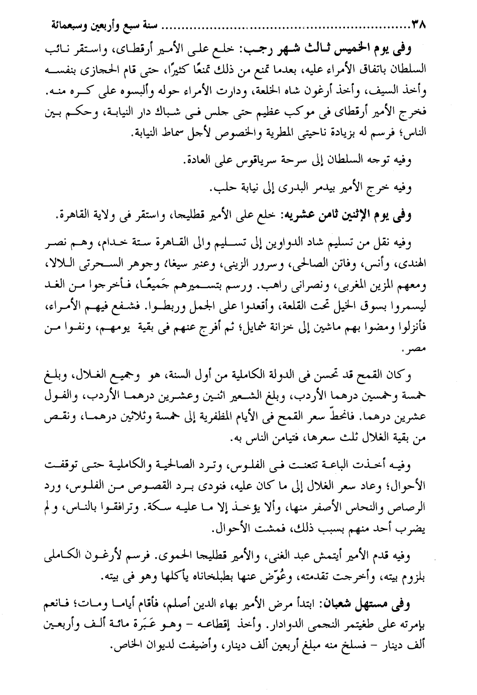 وَفِي يَوْم الْخَمِيس ثَالِث شهر رَجَب: خلع على الْأَمِير أرقطاى وَاسْتقر نَائِب السُّلْطَان بِاتِّفَاق الْأُمَرَاء عَلَيْهِ بَعْدَمَا تمنع من ذَلِك تمنعاً كثيرا حَتَّى قَامَ الْحِجَازِي بِنَفسِهِ وَأخذ السَّيْف وَأخذ أرغون شاه الخلعة ودارت الْأُمَرَاء حوله وألبسوه على كره مِنْهُ. فَخرج الْأَمِير أرقطاى فِي موكب عَظِيم حَتَّى جلس فِي شباك دَار النِّيَابَة وَحكم بَين النَّاس فرسم لَهُ بِزِيَادَة ناحيتي المطرية وَالْخُصُوص لأجل سماط النِّيَابَة. وَفِيه توجه السُّلْطَان إِلَى سرحة سرياقوس على الْعَادة. وَفِيه خرج الْأَمِير بيدمر البدرى إِلَى نِيَابَة حلب. وَفِي يَوْم الْإِثْنَيْنِ ثامن عشريه. خلع على الْأَمِير قطليجا وَاسْتقر فِي ولَايَة الْقَاهِرَة وَفِيه نقل من تَسْلِيم شاد الدَّوَاوِين إِلَى تَسْلِيم وَالِي القاهره سِتَّة خدام وهم نصر الْهِنْدِيّ وَأنس وفاتن الصَّالِحِي وسرور الزيني وَعَنْبَر سيغا وجوهر السحرتى اللالا وَمَعَهُمْ المزين المغربي وَنَصْرَانِي رَاهِب. ورسم بتسميرهم جَمِيعًا فأخرجوا من الْغَد ليسمروا بسوق الْخَيل تَحت القلعة وأقعدوا على الْجمل وربطوا. فشفع فيهم الْأُمَرَاء فأنزلوا ومضوا بهم ماشين إِلَى خزانَة شمايل ثمَّ أفرج عَنْهُم فِي يقية يومهم وَنَفَوْا من مصر وَكَانَ الْقَمْح قد تحسن فِي الدولة الكاملية من أول السّنة هُوَ وَجَمِيع الغلال وَبلغ خَمْسَة وَخمسين درهما الأردب وَبلغ الشّعير اثْنَيْنِ وَعشْرين درهما الأردب والفول عشْرين درهما. فَانْحَطَّ سعر الْقَمْح فِي الْأَيَّام المظفرية إِلَى خَمْسَة وَثَلَاثِينَ درهما وَنقص من بَقِيَّة الغلال ثلث سعرها فتيامن النَّاس بِهِ. وَفِيه أخذت الباعة تتعنت فِي الْفُلُوس وَترد الصالحية والكاملية حَتَّى توقفت الْأَحْوَال وَعَاد سعر الغلال إِلَى مَا كَانَ عَلَيْهِ فَنُوديَ برد القصوص من الْفُلُوس ورد الرصاص والنحاس الْأَصْفَر مِنْهَا وَألا يُؤْخَذ إِلَّا مَا عَلَيْهِ سكَّة. وترافقوا بِالنَّاسِ وَيضْرب أحد مِنْهُم بِسَبَب ذَلِك فمشت الْأَحْوَال. وَفِيه قدم الْأَمِير أيتمش عبد الْغَنِيّ والأمير قطليجا الْحَمَوِيّ. فرسم لأرغون الكاملي بِلُزُوم بَيته وَفِي مستهل شعْبَان: ابْتَدَأَ مرض الْأَمِير بهاء الدّين أصلم فَأَقَامَ أَيَّامًا وَمَات فأنعم بإمرته على طغيتمر النجمي الدوادار. وَأخذ إقطاعه - وَهُوَ عِبْرَة مائَة ألف وَأَرْبَعين ألف دِينَار فسلخ مِنْهُ مبلغ أَرْبَعِينَ ألف دِينَار وأضيفت لديوان الْخَاص.