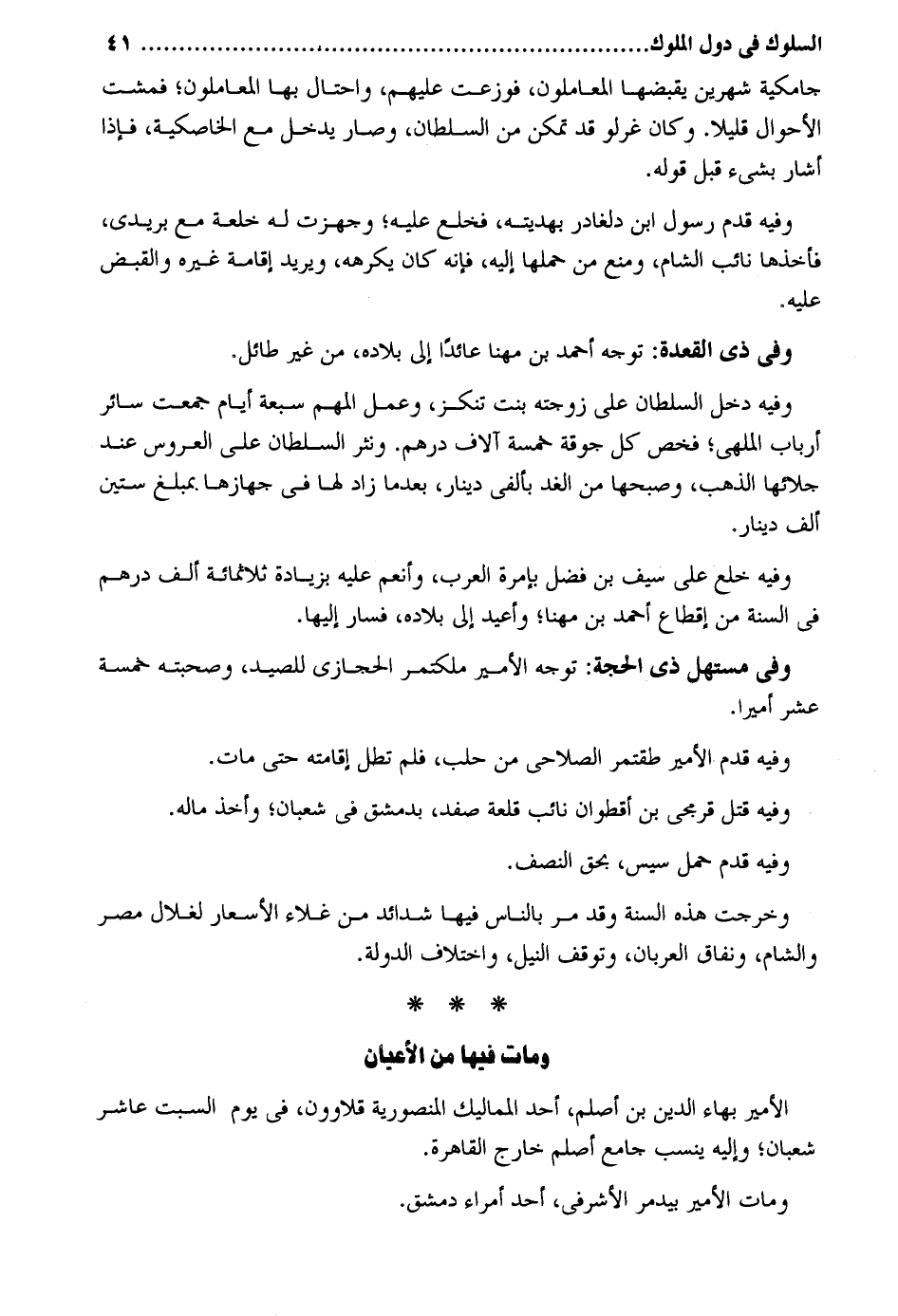 جامكية شَهْرَيْن يقبضهَا المعاملون فوزعت عَلَيْهِم واحتال بهَا المعاملون فمشت الْأَحْوَال قَلِيلا. وَكَانَ غرلو قد تمكن من السُّلْطَان وَصَارَ يدْخل مَعَ الخاصكية فَإِذا أَشَارَ بِشَيْء قبل قَوْله. وَفِيه قدم رَسُول ابْن دلغادر بهديته فَخلع عَلَيْهِ وجهزت لَهُ خلعة مَعَ بريدي فَأَخذهَا نَائِب الشَّام وَمنع من حملهَا إِلَيْهِ فَأَنَّهُ كَانَ يكرههُ وَيُرِيد إِقَامَة غَيره وَالْقَبْض عَلَيْهِ. وَفِي ذِي الْقعدَة: توجه أَحْمد بن مهنا عَائِدًا إِلَى بِلَاده من غير طائل وَفِيه دخل السُّلْطَان على زَوجته بنت تنكز وَعمل المهم سَبْعَة أَيَّام جمعت سَائِر أَرْبَاب الملهى فَخص كل جوقة خَمْسَة آلَاف دِرْهَم. ونثر السُّلْطَان على الْعَرُوس عِنْد جلائها الذَّهَب وَفِيه خلع على سيف بن فضل بإمرة الْعَرَب وأنعم عَلَيْهِ بِزِيَادَة ثَلَاثمِائَة ألف دِرْهَم فِي السّنة من إقطاع أَحْمد بن مهنا وأعيد إِلَى بِلَاده فَسَار إِلَيْهَا. وَفِي مستهل ذِي الْحجَّة: توجه الْأَمِير ملكتمر الْحِجَازِي للصَّيْد وصحبته خَمْسَة عشر أَمِيرا. وَفِيه تقدم الْأَمِير طقتمر الصلاحي من حلب فَلم تطل إِقَامَته حَتَّى مَاتَ. وَفِيه قتل قرمجي بن أقطوان نَائِب قلعة صفد بِدِمَشْق فِي شعْبَان وَأخذ مَاله. وَفِيه قدم حمل سيس بِحَق النّصْف. وَخرجت هَذِه السّنة وَقد مر بِالنَّاسِ فِيهَا شَدَائِد من غلاء الأسعار لغلال مصر وَالشَّام ونفاق العربان وَتوقف النّيل وَاخْتِلَاف الدولة. وَمَات فِيهَا من الْأَعْيَان الْأَمِير بهاء الدّين بن أصلم أحد المماليك المنصورية قلاوون فِي يَوْم السبت عَاشر شعْبَان وَإِلَيْهِ ينْسب جَامع أصلم خَارج الْقَاهِرَة. وَمَات الْأَمِير بيدمر الأشرفي أحد أُمَرَاء دمشق.