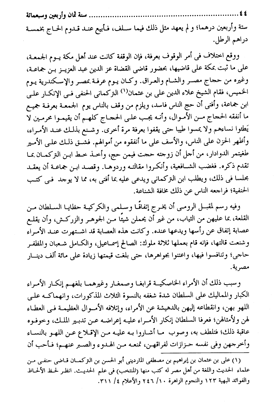 سِتَّة وَأَرْبَعين درهما، وَلم يعْهَد مثل ذَلِك فِيمَا سلف، فأبيع عِنْد قدوم الْحَاج بِخَمْسَة دَرَاهِم الرطل. وَوَقع اخْتِلَاف فِي أَمر الْوُقُوف بِعَرَفَة فَإِن الوقفة كَانَت عِنْد أهل مَكَّة يَوْم الْجُمُعَة على مَا ثَبت. بِمَكَّة على قاضيها بِحُضُور قَاضِي الْقُضَاة عز الدّين عبد الْعَزِيز بن جمَاعَة وَغَيره من حجاج مصر وَالشَّام وَالْعراق. وَكَانَ يَوْم عَرَفَة. بِمصْر والإسكندرية يَوْم الْخَمِيس فَقَامَ الشَّيْخ عَلَاء الدّين عَليّ بن عُثْمَان التركماني الْحَنَفِيّ فِي الْإِنْكَار على ابْن جمَاعَة وَأفْتى أَن حج النَّاس فَاسد وَيلْزم من وقف بِالنَّاسِ يَوْم الْجُمُعَة بِعَرَفَة جَمِيع مَا أنفقهُ الْحجَّاج من الْأَمْوَال وَأَنه يجب على الْحجَّاج كلهم أَن يقيموا محرمين لَا يطئوا نِسَائِهِم وَلَا يمسوا طيبا حَتَّى يقفوا بِعَرَفَة مرّة أُخْرَى. وشنع بذلك عِنْد الْأُمَرَاء وَأظْهر الْحزن على النَّاس والأسف على مَا أنفقوه من أَمْوَالهم. فشق ذَلِك على الْأَمِير طغيتمر الدوادار من أجل أَن زَوجته حجت فِيمَن حج وَأخذ خطّ ابْن التركمان. بِمَا تقدم ذكره. فَغَضب الشَّافِعِيَّة وأنكروا مقَالَته وردوها. وَقصد ابْن جمَاعَة أَن يعْقد مَجْلِسا فِي ذَلِك وَيطْلب ابْن التركماني ويدعى عَلَيْهِ. بِمَا أفتى بِهِ مِمَّا لَا يُوجد فِي كتب الْحَنَفِيَّة فَرَاجعه النَّاس عَن ذَلِك مَخَافَة الشناعة. وَفِيه رسم لمقبل الرُّومِي أَن يخرج إتفاقا وسلمى والكركية حظايا السُّلْطَان من القلعة. بِمَا عَلَيْهِنَّ من الثِّيَاب من غير أَن يحملن شَيْئا من الْجَوْهَر والزركش وَأَن يقْلع عِصَابَة اتِّفَاق عَن رَأسهَا ويدعها عِنْده. وَكَانَت هَذِه الْعِصَابَة قد اشتهرت عِنْد الْأُمَرَاء وشنعت قالتها فَإِنَّهُ قَامَ بعملها ثَلَاثَة مُلُوك: الصَّالح إِسْمَاعِيل والكامل شعْبَان والمظفر حاجي وتنافسوا فِيهَا واعتنوا بجواهرها حَتَّى بلغت قيمتهَا زِيَادَة على مائَة ألف دِينَار مصرية وَسبب ذَلِك أَن الْأُمَرَاء الخاصكية قرابغا وصمغار وَغَيرهمَا بَلغهُمْ إِنْكَار الْأُمَرَاء الْكِبَار والمماليك على السُّلْطَان شدَّة شغفه بالنسوة الثَّلَاث الْمَذْكُورَات وأنهماكه على اللَّهْو بِهن وانقطاعه إلَيْهِنَّ بالدهيشة عَن الْأُمَرَاء وإتلافه الْأَمْوَال الْعَظِيمَة فِي الْعَطاء لَهُنَّ ولأمثالهن فعرفا السُّلْطَان إِنْكَار الْأُمَرَاء عَلَيْهِ إعراضه عَن تَدْبِير الْملك وخوفوه عَاقِبَة ذَلِك فتلطف بِهِ وَصوب مَا أشاروا بِهِ عَلَيْهِ من الإقلاع عَن اللَّهْو بِالنسَاء وأخرجهن وَفِي نَفسه حزازات لفراقهن تَمنعهُ من الهدوء وَالصَّبْر عَنْهُم فَأحب أَن