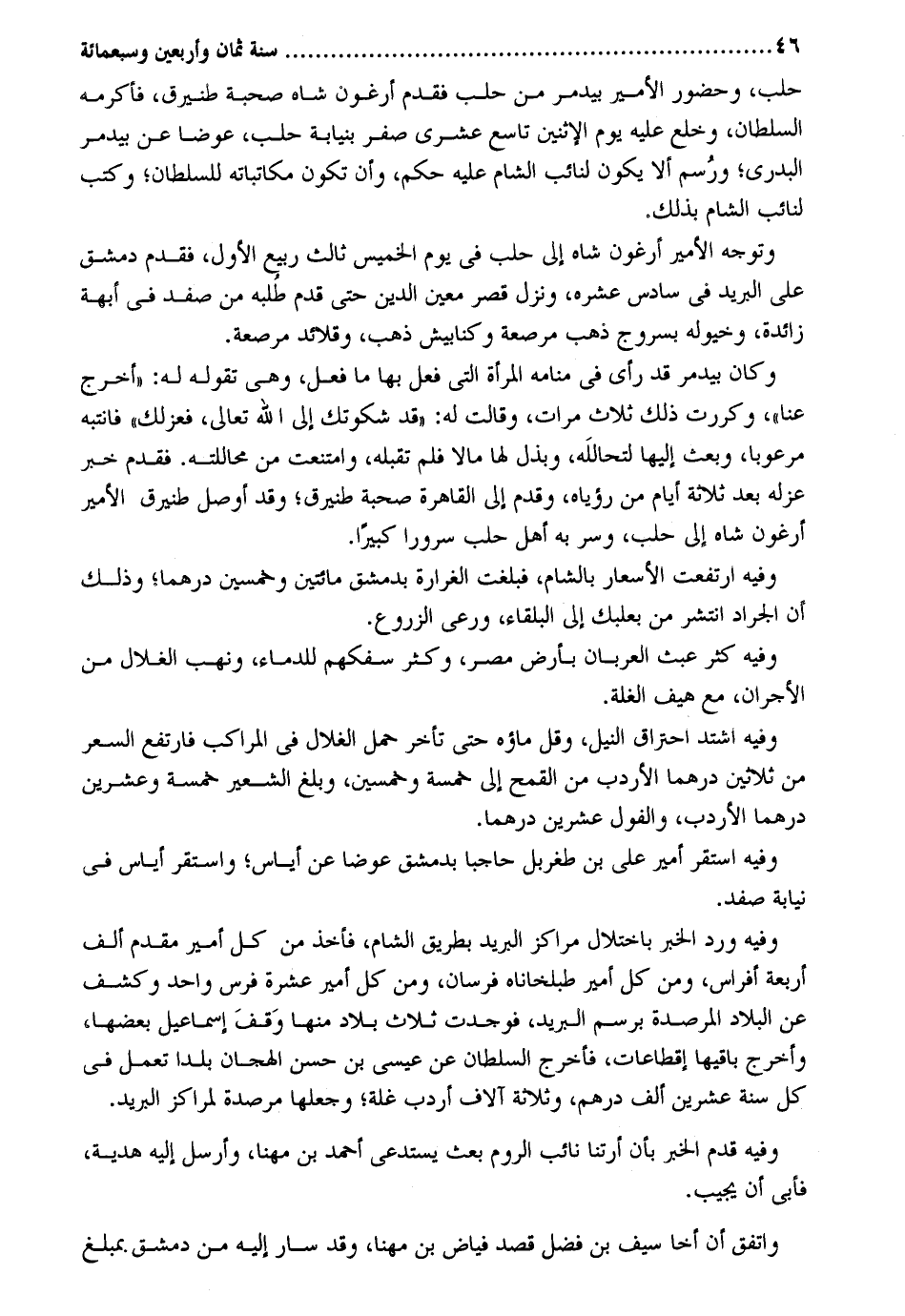حلب وَحُضُور الْأَمِير بيدمر من حلب فَقدم أرغون شاه صُحْبَة طنيرق فَأكْرمه السُّلْطَان وخلع عَلَيْهِ يَوْم الْإِثْنَيْنِ تَاسِع عشرى صفر بنيابة حلب عوضا عَن بيدمر البدري ورسم أَلا يكون لنائب الشَّام عَلَيْهِ حكم وَأَن تكون مكاتباته للسُّلْطَان وكنب لنائب الشَّام بذلك. وَتوجه الْأَمِير أرغون شاه إِلَى حلب فِي يَوْم الْخَمِيس ثَالِث ربيع الأول فَقدم دمشق على الْبَرِيد فِي سادس عشره وَنزل مصر معِين الدّين حَتَّى قدم طلبه من صفد فِي أبهة زَائِدَة وخيوله بسروج ذهب مرصعة وكنابيش ذهب وقلائد مرصعة. وَكَانَ بيدمر قد رأى فِي مَنَامه الْمَرْأَة الَّتِي فعل بهَا مَا فعل وهى تَقوله لَهُ: أخرج عَنَّا وكررت ذَلِك ثَلَاث مَرَّات وَقَالَت لَهُ: قد شكوتك إِلَى الله تَعَالَى فعزلك فأنتبه مَرْعُوبًا وَبعث إِلَيْهَا لتحالله وبذل لَهَا مَالا فَلم تقبله وامتنعت من محاللته. فَقدم خبر عَزله بعد ثَلَاثَة أَيَّام من رُؤْيَاهُ وَقدم إِلَى الْقَاهِرَة صُحْبَة طنيرق وَقد أوصل طنيرق الْأَمِير أرغون شاه إِلَى حلب وسر بِهِ أهل وَفِيه ارْتَفَعت الأسعار بِالشَّام فبلغت الغرارة بِدِمَشْق مِائَتَيْنِ وَخمسين درهما وَذَلِكَ أَن الْجَرَاد انْتَشَر من بعلبك إِلَى البلقاء ورعى الزروع. وَفِيه كثر عَبث العربان بِأَرْض مصر وَكثر سفكهم للدماء وَنهب الغلال من الأجران مَعَ هيف الْغلَّة. وَفِيه اشْتَدَّ احتراق النّيل وَقل مَاؤُهُ حَتَّى تَأَخّر حمل الغلال فِي المراكب فارتفع السّعر من ثَلَاثِينَ درهما الأردب من الْقَمْح إِلَى خَمْسَة وَخمسين وَبلغ الشّعير خَمْسَة وَعشْرين درهما الأردب والفول عشْرين درهما. وَفِيه اسْتَقر أَمِير عَليّ بن طغربل حاجبا بِدِمَشْق عوضا عَن أياس وَاسْتقر أياس فِي نِيَابَة صفد. وَفِيه ورد الْخَبَر باختلال مراكز الْبَرِيد بطرِيق الشَّام فَأخذ من كل أَمِير مقدم ألف أَرْبَعَة أَفْرَاس وَمن كل أَمِير طبلخاناه فرسَان وَمن كل أَمِير عشرَة فرس وَاحِد وكشف عَن الْبِلَاد المرصدة برسم الْبَرِيد فَوجدت ثَلَاث بِلَاد مِنْهَا وقف إِسْمَاعِيل بَعْضهَا وَأخرج بَاقِيهَا إقطاعات فَأخْرج السُّلْطَان عَن عِيسَى بن حسن الهجان بَلَدا تعْمل فِي كل سنة عشْرين ألف دِرْهَم وَثَلَاثَة آلَاف أردب غلَّة وَجعلهَا مرصدة لمراكز الْبَرِيد. وَفِيه قدم الْخَبَر بِأَن أرتنا نَائِب الرّوم بعث يَسْتَدْعِي أَحْمد بن مهنا وَأرْسل إِلَيْهِ هَدِيَّة فَأبى أَن يُجيب. وَاتفقَ أَن أَخا سيف بن فضل قصد فياض بن مهنا وَقد سَار إِلَيْهِ من دمشق بمبلغ