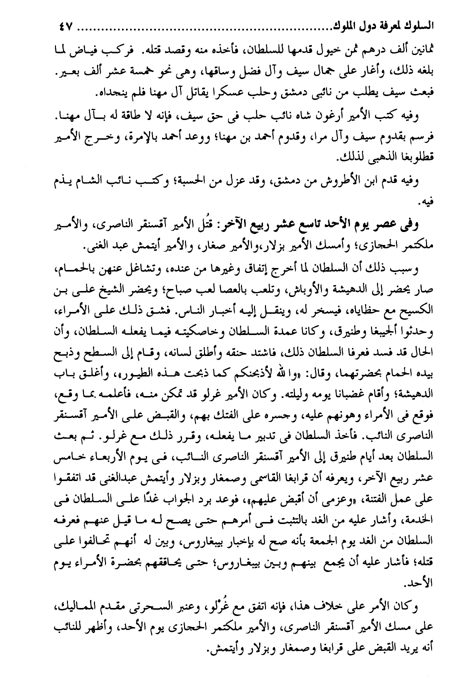 ثَمَانِينَ ألف دِرْهَم ثمن خُيُول قدمهَا للسُّلْطَان فَأَخذه مِنْهُ وَقصد قَتله. فَركب فياض لما بلغه ذَلِك وأغار على جمال سيف وَآل فضل وساقها وَهِي نَحْو خَمْسَة عشر ألف بعير. فَبعث سيف يطْلب من نائبي دمشق وحلب عسكراً يُقَاتل آل مهنا فَلم ينجداه. وَفِيه كتب الْأَمِير أرغون شاه نَائِب حلب فِي حق سيف فَإِنَّهُ لَا طَاقَة لَهُ بآل مهنا. فرسم بقدوم سيف وَآل مرا وقدوم أَحْمد بن مهنا ووعد أَحْمد بالإمرة وَخرج الْأَمِير قطلوبغا الذَّهَبِيّ لذَلِك. وَفِيه قدم ابْن الأطروش من دمشق وَقد عزل من الْحِسْبَة وَكتب نَائِب الشَّام يذم فِيهِ وَفِي عصر يَوْم الْأَحَد تَاسِع عشر ربيع الآخر: قتل الْأَمِير آقسنقر الناصري والأمير ملكتمر الْحِجَازِي وَأمْسك الْأَمِير بزلار والأمير صغَار والأمير أيتمش عبد الْغَنِيّ. وَسبب ذَلِك أَن السُّلْطَان لما أخرج إتفاق وَغَيرهَا من عِنْده وتشاغل عَنْهُن بالحمام صَار يحضر إِلَى الدهيشة والأوباش وتلعب بالعصا لعب صباح ويحضر الشَّيْخ عَليّ بن الكسيح مَعَ حظاياه فيسخر لَهُ وينقل إِلَيْهِ أَخْبَار النَّاس. فشق ذَلِك على الْأُمَرَاء حدثوا ألجيبغا وطينرق وَكَانَا عُمْدَة السُّلْطَان وخاصكيته فِيمَا يَفْعَله السُّلْطَان وَأَن الْحَال قد فسد فعرفا السُّلْطَان ذَلِك فَاشْتَدَّ حنقه وَأطلق لِسَانه وَقَامَ إِلَى السَّطْح وَذبح الْحمام بحضرتهما وَقَالَ: وَالله لأذبحنكم كَمَا ذبحت هَذِه الطُّيُور وأغلق بَاب الدهيشة وَأقَام غضبانا يَوْمه وَلَيْلَته. وَكَانَ الْأَمِير غرلو قد تمكن مِنْهُ فَأعلمهُ. بِمَا وَقع فَوَقع فِي الْأُمَرَاء وهونهم عَلَيْهِ وجسره على الفتك بهم وَالْقَبْض على الْأَمِير آقسنقر الناصري النَّائِب. فَأخذ السُّلْطَان فِي تَدْبِير مَا يَفْعَله وَقرر ذَلِك مَعَ غرلو. ثمَّ بعث السُّلْطَان بعد أَيَّام طنيرق إِلَى الْأَمِير آقسنقر الناصري النَّائِب فِي يَوْم الْأَرْبَعَاء خَامِس ربيع الآخر ويعرفه أَن قرابغا القاسمي وصمغار وبزلار وأيتمش عبد الْغَنِيّ قد اتَّفقُوا على الْفِتْنَة وعزمي أَن أَقبض عَلَيْهِم فوعد برد الْجَواب غَدا على السُّلْطَان فِي الْخدمَة وَأَشَارَ عَلَيْهِ من الْغَد بالتثبت فِي أَمرهم حَتَّى يَصح لَهُ مَا قيل عَنْهُم فَعرفهُ السُّلْطَان من الْغَد يَوْم الْجُمُعَة بِأَنَّهُ صَحَّ لَهُ بِإِخْبَار بيبغاروس وَبَين لَهُ أَنهم تحالفوا على قَتله فَأَشَارَ عَلَيْهِ أَن يجمع بَينهم وَبَين بيبغاروس حَتَّى يحاققهم بِحَضْرَة الْأُمَرَاء يَوْم الْأَحَد. وَكَانَ الْأَمر على خلاف هَذَا فَإِنَّهُ اتّفق مَعَ غرلو وَعَنْبَر السحرتى مقدم المماليك على مسك الْأَمِير آقسنقر الناصري والأمير ملكتمر الْحِجَازِي يَوْم الْأَحَد وَأظْهر للنائب أَنه يُرِيد الْقَبْض على قرابغا وصمغار وبزلار وأيتمش.