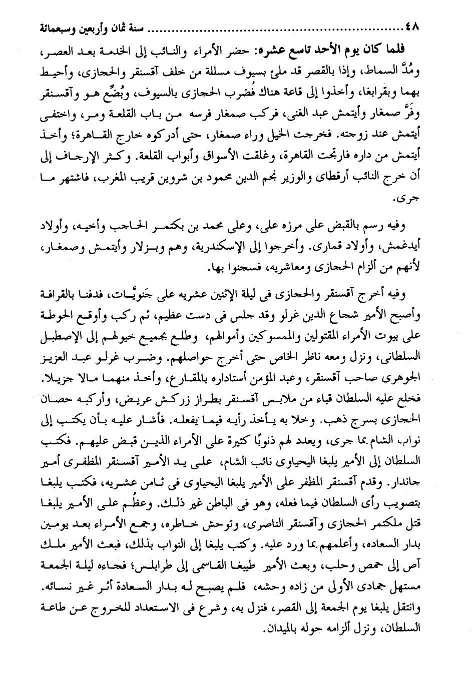 فَلَمَّا كَانَ يَوْم الْأَحَد تَاسِع عشره: حضر الْأُمَرَاء والنائب إِلَى الْخدمَة بعد الْعَصْر وَمد السماط وَإِذا بِالْقصرِ قد ملئ بسيوف مسللة من خلف آقسنقر والحجازي وأحيط بهما وبقرابغا وَأخذُوا إِلَى قاعة هُنَاكَ فَضرب الْحِجَازِي بِالسُّيُوفِ وبضع هُوَ وآقسنقر وفر صمغار وأيتمش عبد الْغنى فَركب صمغار فرسه من بَاب القلعة وَمر واختفى أيتمش عِنْد زَوجته. فَخرجت الْخَيل وَرَاء صمغار حَتَّى أدركوه خَارج الْقَاهِرَة وَأخذ أيتمش من دَاره فارتجت الْقَاهِرَة وغلقت الْأَسْوَاق وأبواب القلعة. وَكثر الإرجاف إِلَى أَن خرج النَّائِب أرقطاى والوزير نجم الدّين مَحْمُود بن شروين قريب الْمغرب فاشتهر مَا جرى. وَفِيه رسم بِالْقَبْضِ على مرزه عَليّ وعَلى مُحَمَّد بن بكتمر الْحَاجِب وأخيه وَأَوْلَاد أيدغمش وَأَوْلَاد قمارى. وأخرجوا إِلَى الْإسْكَنْدَريَّة وهم وبزلار وأيتمش وصمغار لأَنهم من ألزام الْحِجَازِي ومعاشريه فسجنوا بهَا. وَفِيه أخرج آقسنقر والحجازي فِي لَيْلَة الإثنينعشريه على جنويات فدفنا بالقرافة وَأصْبح الْأَمِير شُجَاع الدّين غرلو وَقد جلس فِي دست عَظِيم ثمَّ ركب وأوقع الحوطة على بيُوت الْأُمَرَاء المقتولين والممسوكين وَأَمْوَالهمْ وطلع بِجَمِيعِ خيولهم إِلَى الإصطبل السلطاني وَنزل وَمَعَهُ نَاظر الْخَاص حَتَّى أخرج حواصلهم. وَضرب غرلو عبد الْعَزِيز الْجَوْهَرِي صَاحب آقسنقر وَعبد الْمُؤمن أستاداره بالمقارع وَأخذ مِنْهُمَا مَالا جزيلا. فَخلع عَلَيْهِ السُّلْطَان قبَاء من ملابسي آقسنقر بطراز زركش عريض وأركبه حصان الججازي بسرج ذهب وخلا بِهِ يَأْخُذ رَأْيه فِيمَا. يَفْعَله. فَأَشَارَ عَلَيْهِ بِأَن يكْتب إِلَى نوابي الشَّام. بِمَا جرى ويعدد لَهُم ذنوبا كَثِيرَة على الْأُمَرَاء الَّذين قبض عَلَيْهِم. فَكتب السُّلْطَان إِلَى الْأَمِير يلبغا اليحياوي نَائِب الشَّام على يَد الْأَمِير آقسنقر المظفري أَمِير جاندار. وَقدم آقسنقر المظفر على الْأَمِير يلبغا اليحياوي فِي ثامن عشريه فَكتب يلبغا بتصويب رَأْي السُّلْطَان فِيمَا فعله وَهُوَ فِي الْبَاطِن غير ذَلِك. وَعظم على الْأَمِير يلبغا قتل ملكتمر الْحِجَازِي وآقسنقر الناصري وتوحش خاطره وَجمع الْأُمَرَاء بعد يَوْمَيْنِ بدار السَّعَادَة وأعلمهم. بِمَا ورد عَلَيْهِ. وَكتب يلبغا إِلَى النواب بذلك فَبعث الْأَمِير ملك آص إِلَى حمص وحلب وَبعث الْأَمِير طيبغا القاسمي إِلَى طرابلس فَجَاءَهُ لَيْلَة الْجُمُعَة مستهل جُمَادَى الأولى من زَاده وحشه فَلم يصبح لَهُ بدار السَّعَادَة أثر غير نِسَائِهِ. وانتقل يلبغا يَوْم الْجُمُعَة إِلَى الْقصر فَنزل بِهِ وَشرع فِي الاستعداد لِلْخُرُوجِ عَن طَاعَة السُّلْطَان وَنزل إِلْزَامه حوله بالميدان.