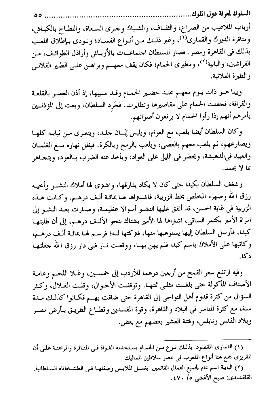 أَرْبَاب الملاعيب من الصراع والثقاف والشباك وَجرى السعاة والنطاح بالكباش ومناقرة الديوك والقمارى وَغير ذَلِك من أَنْوَاع الْفساد وَنُودِيَ بِإِطْلَاق اللّعب بذلك فِي الْقَاهِرَة ومصر. فَصَارَ للسُّلْطَان اجتماعات بالأوباش وأراذل الطوائف من الفراشين والبابية ومطيري الْحمام فَكَانَ يقف مَعَهم ويراهن على الطير الْفُلَانِيّ والطيرة الْفُلَانِيَّة. وَبينا هُوَ ذَات يَوْم مَعَهم عِنْد حضير الْحمام وَقد سيبها إِذْ أذن الْعَصْر بالقلعة والقرافة فجفلت الْحمام على مقاصرها وتطايرت. فَجرد السُّلْطَان وَبعث إِلَى المؤذنين يَأْمُرهُم أَنهم إِذا رَأَوْا الْحمام لَا يرفعون أَصْوَاتهم. وَكَانَ السُّلْطَان أَيْضا يلْعَب مَعَ الْعَوام ويلبس تبان جلد ويتعرى من ثِيَابه كلهَا ثمَّ يلْعَب مَعَهم بالعصى ويلعب بِالرُّمْحِ وبالكرة. فيظل نَهَاره مَعَ الغلمان وَالْعَبِيد الدهيشة ويحضر فِي اللَّيْل وشغف السُّلْطَان بكيدا حَتَّى كَانَ لَا يكَاد يفارقها وَاشْترى لَهَا أَمْلَاك النشو وأخيه رزق الله وصهره المخلص بِخَط الزربية فاشتراها لَهَا بِمِائَة ألف دِرْهَم. وَكَانَت هَذِه الزريبة فِي غَايَة الْحسن قد أنْفق عَلَيْهَا النشو أَمْوَالًا عَظِيمَة وَصَارَت بعد النشو إِلَى إمرأة الْأَمِير بكتمر الساقي اشْتَرَاهَا لَهَا الْأَمِير بشتاك بِنَحْوِ الْألف دِرْهَم إِلَى أَن طلبتها كيدا فَأرْسل السُّلْطَان إِلَيْهَا يستوهبها مِنْهَا فتركتها لَهُ فرسم لَهَا بِمِائَة ألف دِرْهَم وكاتبها على الْأَمْلَاك باسم كيدا فَلم يهن بهَا وَوَقعت نَار فِي دَار رزق الله جَعلتهَا دكاً. وفيهَا ارْتَفع سعر الْقَمْح من أَرْبَعِينَ درهما للأردب إِلَى خمسين وغلا اللَّحْم وَعَامة الْأَصْنَاف المأكولة حَتَّى بلغت مثلى ثمنهَا. وتوقفت الْأَحْوَال وَقلت الغلال وَكثر ة قدوم أهل النواحي إِلَى الْقَاهِرَة حَتَّى ضَاقَتْ بهم فَكَانُوا كَذَلِك مُدَّة سنة مَعَ كَثْرَة المناسر فِي الْبِلَاد والقاهرة وَقُوَّة المفسدين وقطاع الطَّرِيق بِأَرْض مصر وبلاد الْقُدس ونابلس وفتنة العشير بَعضهم مَعَ بعض.