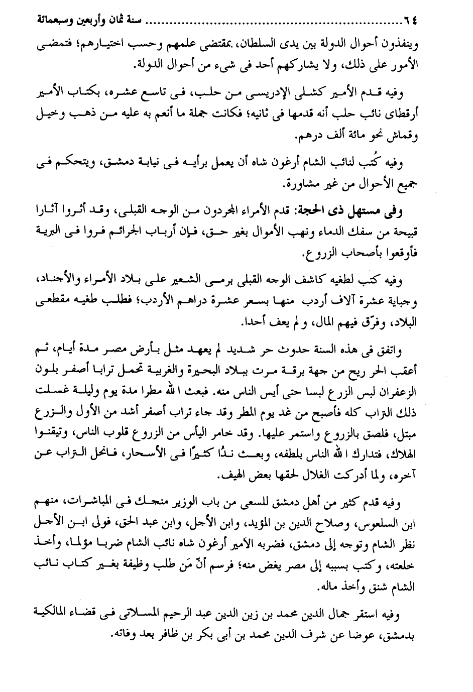 وينفذون أَحْوَال الدولة بَين يَدي السُّلْطَان بِمُقْتَضى علمهمْ وَحسب اختيارهم فتمضي الْأُمُور على ذَلِك وَلَا يشاركهم أحد فِي شَيْء من أَحْوَال الدولة. وَفِيه قدم الْأَمِير كشلى الإدريسي من حلب فِي تَاسِع عشره بِكِتَاب الْأَمِير أرقطاى نَائِب حلب أَنه قدمهَا فِي ثَانِيه فَكَانَت جملَة مَا أنعم بِهِ عَلَيْهِ من ذهب وخيل وقماش نَحْو مائَة ألف دِرْهَم. وَفِيه كتب لنائب الشَّام أرغون شاه أَن يعْمل بِرَأْيهِ فِي نِيَابَة دمشق ويتحكم فِي جَمِيع الْأَحْوَال من غير مُشَاورَة. وَفِي مستهل ذِي الْحجَّة: قدم الْأُمَرَاء المجردون الْوَجْه القبلي وَقد أثروا آثارا قبيحة من سفك الدِّمَاء وَنهب الْأَمْوَال بِغَيْر حق فَإِن أَرْبَاب الجرائم فروا فِي الْبَريَّة فأوقعوا بأصحاب الزروع. وَفِيه كتب لطغيه كاشف الْوَجْه القبلي برمي الشّعير على بِلَاد الْأُمَرَاء والأجناد وجباية عشرَة آلَاف أردب مِنْهَا بِسعْر عشرَة دَرَاهِم الأردب فَطلب طغيه مقطعي الْبِلَاد وَفرق فيهم المَال وواتفق فِي هَذِه السّنة حُدُوث حر شَدِيد لم يعْهَد مثل بِأَرْض مصر مُدَّة أَيَّام ثمَّ أعقب الْحر ريح من جِهَة برقه مرت بِبِلَاد الْبحيرَة والغربية تحمل تُرَابا أصفر بلون الزَّعْفَرَان لبس الزَّرْع لبساً حَتَّى أيس النَّاس مِنْهُ. فَبعث الله مَطَرا مُدَّة يَوْم وَلَيْلَة غسلت ذَلِك التُّرَاب كُله فَأصْبح من غَد يَوْم الْمَطَر وَقد جَاءَ تُرَاب أصفر أَشد من الأول وَالزَّرْع مبتل فلصق بالزروع وَاسْتمرّ عَلَيْهَا. وَقد خامر الْيَأْس من الزروع قُلُوب النَّاس وتيقنوا الْهَلَاك فتدارك الله النَّاس بِلُطْفِهِ وَبعث ندا كثيرا فِي الأسحار فأنحل التُّرَاب عَن أَخّرهُ وَلما أدْركْت الغلال لحقها بعض الهيف. وَفِيه قدم كثير من أهل دمشق للسعي من بَاب الْوَزير منجك فِي المباشرات مِنْهُم ابْن السلعوس وَصَلَاح الدّين بن الْمُؤَيد وَابْن الْأَجَل وَابْن عبد الْحق فولى ابْن الْأَجَل نظر الشَّام وَتوجه إِلَى دمشق فَضَربهُ الْأَمِير أرغون شاه نَائِب الشَّام ضربا مؤلماً وَأخذ خلعته وَكتب بِسَبَبِهِ إِلَى مصر يغض مِنْهُ فرسم أَن من طلب وَظِيفَة بِغَيْر كتاب نَائِب الشَّام شنق وَأخذ مَاله. وَفِيه اسْتَقر جمال الدّين مُحَمَّد بن زين الدّين عبد الرَّحِيم المسلاتي فِي قَضَاء الْمَالِكِيَّة بِدِمَشْق عوضا عَن شرف الدّين مُحَمَّد بن أبي بكر بن ظافر بعد وَفَاته.