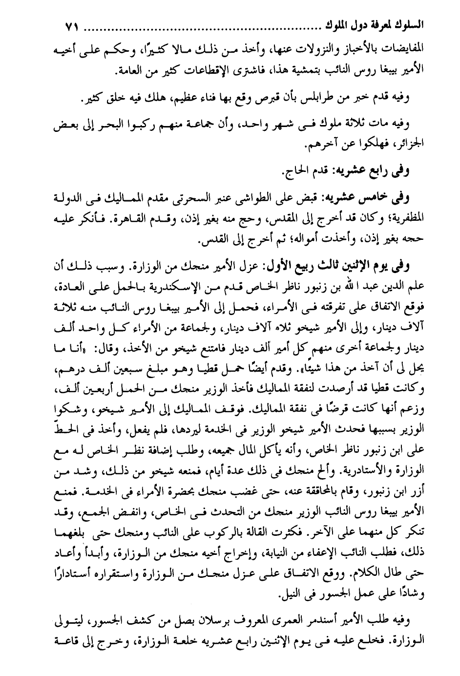 المفايضات بالأخباز والنزولات عَنْهَا وَأخذ من ذَلِك مَالا كثيرا وَحكم على أَخِيه الْأَمِير بيبغا روس النَّائِب بتمشية هَذَا فَاشْترى الإقطاعات كثير من الْعَامَّة. وَفِيه قدم خبر من طرابلس بِأَن قبرص وَقع بهَا فنَاء عَظِيم هلك فِيهِ خلق كثير. وَفِيه مَاتَ ثَلَاثَة مُلُوك فِي شهر وَاحِد وَأَن جمَاعَة مِنْهُم ركبُوا الْبَحْر إِلَى بعض الجزائر فهلكوا عَن آخِرهم. وَفِي رَابِع عشريه: قدم الْحَاج. وَفِي خَامِس عشريه: قبض على الطواشي عنبر السحرتي مقدم المماليك فِي الدولة المظفرية وَكَانَ قد أخرج إِلَى الْمُقَدّس وَحج مِنْهُ بِغَيْر إِذن وَقدم الْقَاهِرَة. فَأنْكر عَلَيْهِ حجه بِغَيْر إِذن وَأخذت أَمْوَاله ثمَّ أخرج إِلَى الْقُدس. وَفِي يَوْم الْإِثْنَيْنِ ثَالِث ربيع الأول: عزل الْأَمِير منجك من الوزارة. وَسبب ذَلِك أَن علم الدّين عبد الله بن زنبور نَاظر الْخَاص قدم من الاسكندرية بِالْحملِ على الْعَادة فَوَقع الِاتِّفَاق على تفرقته فِي الْأُمَرَاء فَحمل إِلَى الْأَمِير بيبغا روس النَّائِب مِنْهُ ثَلَاثَة آلَاف دِينَار وَإِلَى الْأَمِير شيخو ثَلَاثَة آلَاف دِينَار ولجماعة من الْأُمَرَاء كل وَاحِد ألف دِينَار ولجماعة أُخْرَى مِنْهُم كل أَمِير ألف دِينَار فَامْتنعَ شيخو من الْأَخْذ وَقَالَ: أَنا مَا يحل لي أَن أَخذ من هَذَا شَيْئا وَقدم أَيْضا حمل قطيا وَهُوَ مبلغ سبعين ألف دِرْهَم وَكَانَت قطيا قد أرصدت لنفقة المماليك فَأخذ الْوَزير منجك من الْحمل أَرْبَعِينَ ألف وَزعم أَنَّهَا كَانَت قرضا فِي نَفَقَة المماليك. فَوقف المماليك إِلَى الْأَمِير شيخو وَشَكوا الْوَزير بِسَبَبِهَا فَحدث الْأَمِير شيخو الْوَزير فِي الْخدمَة ليردها فَلم يفعل وَأخذ فِي الْحَط على ابْن زنبور نَاظر الْخَاص وَأَنه يَأْكُل المَال جَمِيعه وَطلب إِضَافَة نظر الْخَاص لَهُ مَعَ الوزارة والأستادرية. وألح منجك فِي ذَلِك عدَّة أَيَّام فَمَنعه شيخو من ذَلِك وَشد من أزر ابْن زنبور وَقَامَ بالمحاققة عَنهُ حَتَّى غضب منجك بِحَضْرَة الْأُمَرَاء فِي الْخدمَة. فَمنع الْأَمِير بيبغا روس النَّائِب الْوَزير منجك من التحدث فِي الْخَاص وانفض الْجمع وَقد تنكر كل مِنْهُمَا على الآخر. فكثرت القالة بالركوب على النَّائِب ومنجك حَتَّى بلغهما ذَلِك فَطلب النَّائِب الاعفاء من النِّيَابَة وَإِخْرَاج أَخِيه منجك من الوزارة وأبدأ وَأعَاد حَتَّى طَال الْكَلَام. وَوَقع الِاتِّفَاق على عزل منجك من الوزارة واستقراره أستادارا وشادا على عمل الجسور فِي النّيل. وَفِيه طلب الْأَمِير أسندمر الْعمريّ الْمَعْرُوف برسلان بصل من كشف الجسور ليتولى الوزارة. فَخلع عَلَيْهِ فِي يَوْم الْإِثْنَيْنِ رَابِع عشريه خلعة الوزارة وَخرج إِلَى قاعة
