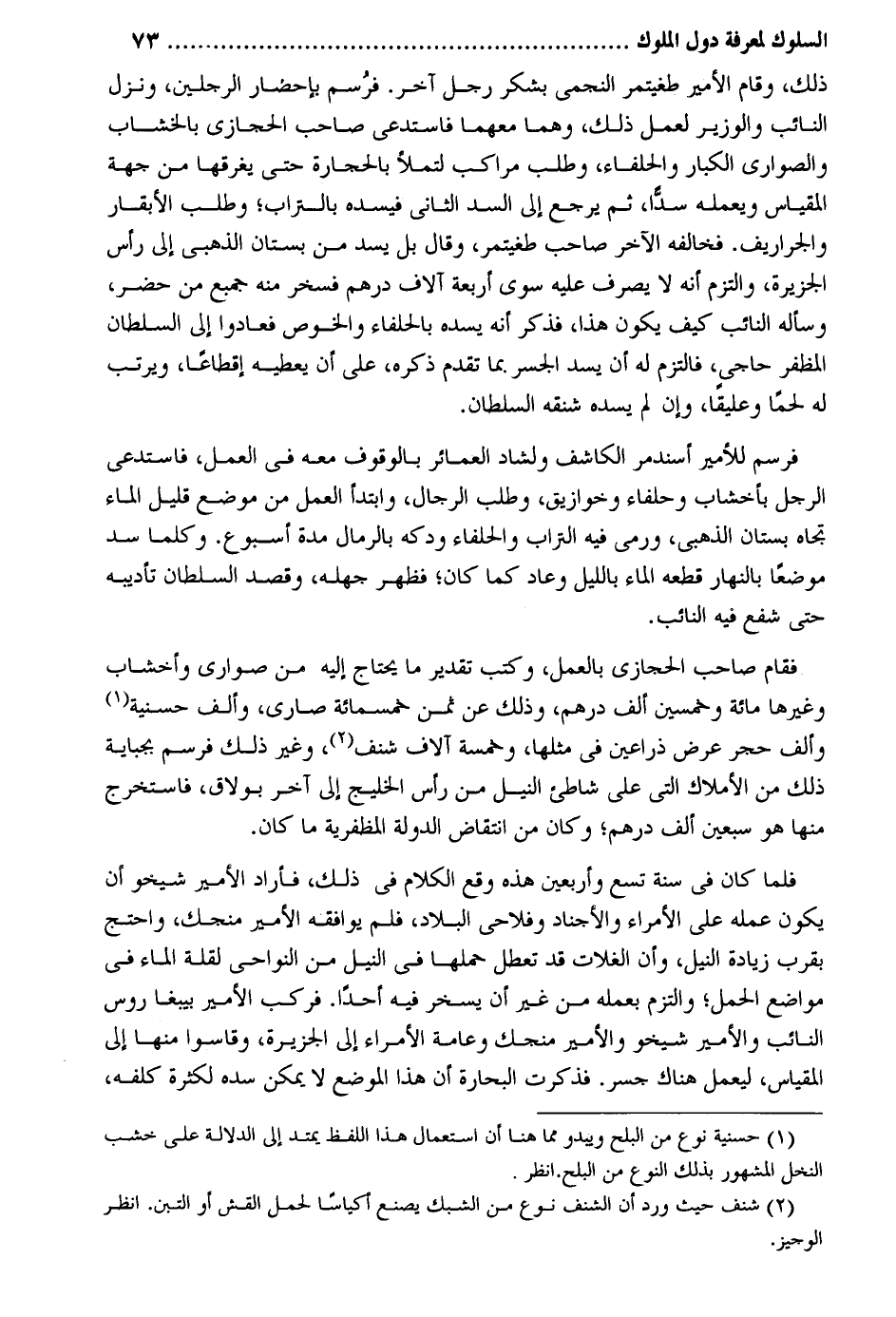 ذَلِك وَقَامَ الْأَمِير طغيتمر النجمي بشكر رجل آخر. فرسم بإحضار الرجلَيْن وَنزل النَّائِب والوزير لعمل ذَلِك وهما مَعَهُمَا فاستدعى صَاحب الْحِجَازِي بالخشاب والصواري الْكِبَار والحلفاء وَطلب مراكب لتملأ بِالْحِجَارَةِ حَتَّى يغرقها من جِهَة المقياس ويعمله سداً ثمَّ يرجع إِلَى السد الثَّانِي فيسده بِالتُّرَابِ وَطلب الأبقار والجراريف فخالفه الآخر صَاحب طغيتمر وَقَالَ بل يسد من بُسْتَان الذَّهَبِيّ إِلَى رَأس الجزيرة وَالْتزم أَنه لَا يصرف عَلَيْهِ سوى أَرْبَعَة آلَاف دِرْهَم فَسخرَ مِنْهُ جَمِيع من حضر النَّائِب كَيفَ يكون هَذَا فَذكر أَنه يسده بالحلفاء والخوص فعادوا إِلَى السُّلْطَان المظفر حاجي فالتزم لَهُ أَن يسد الجسر. مِمَّا تقدم ذكره على أَن يُعْطِيهِ إقطاعاً ويرتب لَهُ لَحْمًا وعليقاً وَأَن لم يسده شنقه السُّلْطَان. فرسم للأمير أسندمر الكاشف ولشاد العمائر بِالْوُقُوفِ مَعَه فِي الْعَمَل فاستدعى الرجل بأخشاب وحلفاء وخوازيق وَطلب الرِّجَال وابتدأ الْعَمَل من مَوضِع قَلِيل المَاء تجاه بُسْتَان الذَّهَبِيّ وَرمى فِيهِ التُّرَاب والحلفاء ودكه بالرمال مُدَّة أُسْبُوع. وَكلما سد موضعا بِالنَّهَارِ قطعه المَاء بِاللَّيْلِ وَعَاد كَمَا كَانَ فَظهر جَهله وَقصد السُّلْطَان تأديبه حَتَّى شفع فِيهِ النَّائِب. فَقَامَ صَاحب الْحِجَازِي بِالْعَمَلِ وَكتب تَقْدِير مَا يحْتَاج إِلَيْهِ من صواري وأخشاب وَغَيرهَا مائَة وَخمسين ألف دِرْهَم وَذَلِكَ عَن ثمن خَمْسمِائَة صاري وَألف حسنية وَألف حجر عرض ذراعين فِي مثلهَا وَخَمْسَة آلَاف شنف وَغير ذَلِك فرسم بجباية ذَلِك من الْأَمْلَاك الَّتِي على شاطئ النّيل من رَأس الخليج إِلَى آخر بولاق فاستخرج مِنْهَا هُوَ سبعين ألف دِرْهَم وَكَانَ من انْتِقَاض الدولة المظفرية مَا كَانَ. فَلَمَّا كَانَ فِي سنة تسع وَأَرْبَعين هَذِه وَقع الْكَلَام فِي ذَلِك فَأَرَادَ الْأَمِير شيخو أَن يكون عمله على الْأُمَرَاء والأجناد وفلاحي الْبِلَاد فَلم يُوَافقهُ الْأَمِير منجك وَاحْتج بِقرب زِيَادَة النّيل وَأَن الغلات قد تعطل حملهَا فِي النّيل من النواحي لقلَّة المَاء فِي مَوَاضِع الْحمل وَالْتزم بِعَمَلِهِ من غير أَن يسخر فِيهِ أحدا. فيكب الْأَمِير بيبغا روس النَّائِب والأمير شيخو والأمير منجك وَعَامة الْأُمَرَاء إِلَى الجزيرة وقاسوا مِنْهَا إِلَى المقياس ليعْمَل هُنَاكَ جسر. فَذكرت البحارة أَن هَذَا الْموضع لَا يُمكن سَده لِكَثْرَة كلفه