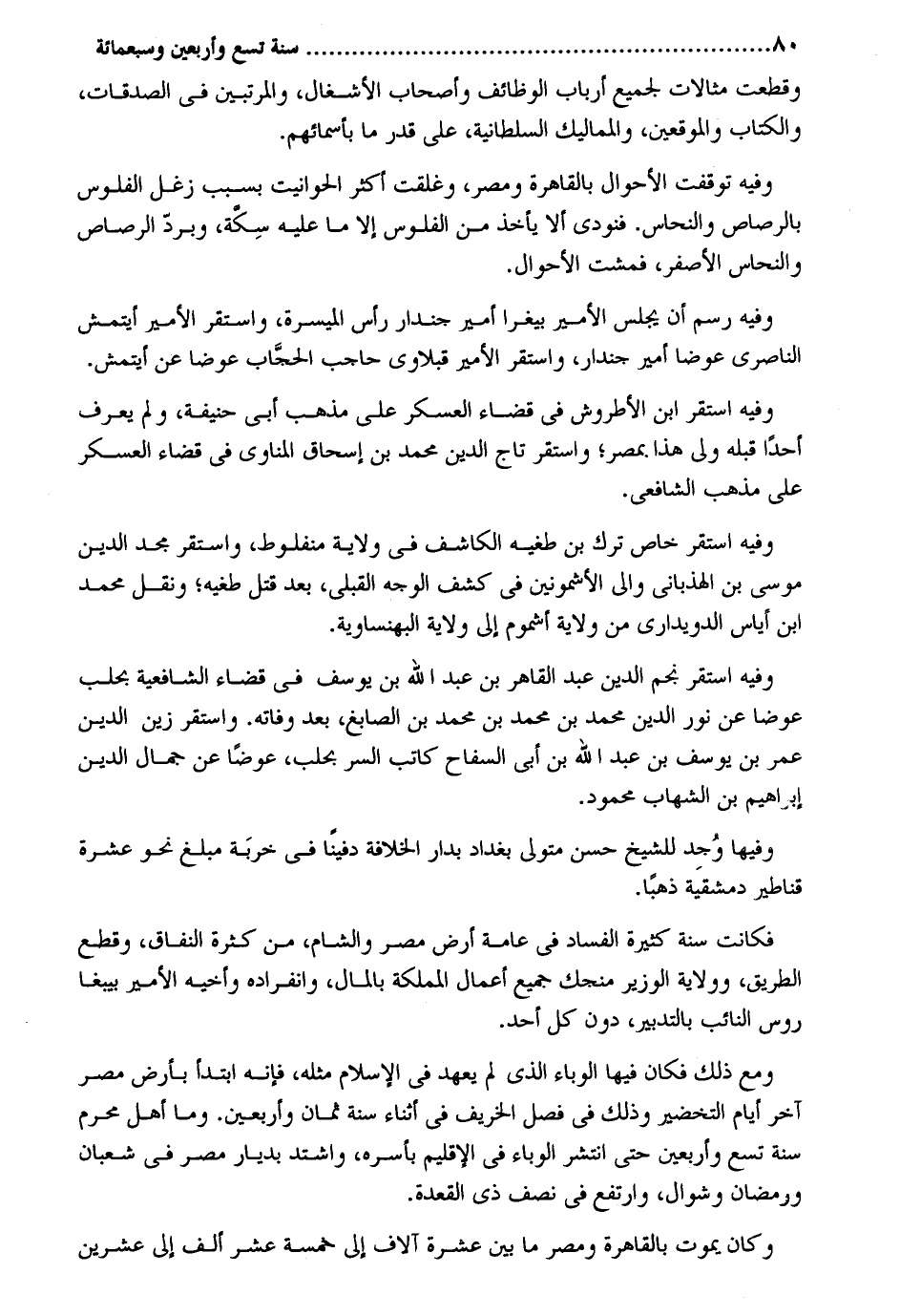 وَقطعت مثالات لجَمِيع أَرْبَاب الْوَظَائِف وَأَصْحَاب الأشغال والمرتبين فِي الصَّدقَات وَالْكتاب والموقعين والمماليك السُّلْطَانِيَّة على قدر مَا بِأَسْمَائِهِمْ. وَفِيه توقفت الْأَحْوَال بِالْقَاهِرَةِ ومصر وغلقت أَكثر الحوانيت بِسَبَب زغل الْفُلُوس بالرصاص والنحاس. فَنُوديَ أَلا يَأْخُذ من الْفُلُوس إِلَّا مَا عَلَيْهِ سكَّة وَبرد الرصاص والنحاس الْأَصْفَر فمشت الْأَحْوَال. وَفِيه رسم أَن يجلس الْأَمِير بيغرا أَمِير جندار رَأس الميسرة وَاسْتقر الْأَمِير أيتمش الناصري عوضا أَمِير جندار وَاسْتقر الْأَمِير قبلاوي حاحب الْحجاب عوضا عَن أيتمش. وَفِيه اسْتَقر ابْن الأطروش فِي قَضَاء الْعَسْكَر على مَذْهَب أَبى حنيفَة وَلم يعرف أحدا قبله ولي هَذَا. بِمصْر وَاسْتقر تَاج الدّين مُحَمَّد بن إِسْحَاق الْمَنَاوِيّ فِي قَضَاء الْعَسْكَر على مَذْهَب الشَّافِعِي. وَفِيه اسْتَقر خَاص ترك بن طغيه الكاشف فِي ولَايَة منفلوط وَاسْتقر مجد الدّين مُوسَى بن الهذباني وَالِي الأشمونين فِي كشف الْوَجْه القبلي بعد قتل طغيه بِمَ وَنقل مُحَمَّد ابْن أياس الدويداري من ولَايَة أشموم إِلَى ولَايَة البهنساوية. وَفِيه اسْتَقر نجم الدّين عبد القاهر بن عبد الله بن يُوسُف فِي قَضَاء الشَّافِعِيَّة بحلب عوضا عَن نور الدّين مُحَمَّد بن مُحَمَّد بن مُحَمَّد بن الصابغ بعد وَفَاته. وَاسْتقر زين الدّين عمر بن يُوسُف بن عبد الله بن أبي السفاح كَاتب السِّرّ بحلب عوضا عَن جمال الدّين إِبْرَاهِيم بن الشهَاب مَحْمُود. وفيهَا وجد للشَّيْخ حسن مُتَوَلِّي بَغْدَاد بدار الْخلَافَة دَفِينا فِي خربة مبلغ نَحْو عشرَة قناطير دمشقية ذَهَبا. فَكَانَت سنة كَثِيرَة الْفساد فِي عَامَّة أَرض مصر وَالشَّام من كَثْرَة النِّفَاق وَقطع الطَّرِيق وَولَايَة الْوَزير منجك جَمِيع أَعمال المملكة بِالْمَالِ وانفراده وأخيه الْأَمِير بيبغا روس النَّائِب بِالتَّدْبِيرِ دون كل أحد. وَمَعَ ذَلِك فَكَانَ فِيهَا الوباء الَّذِي لم يعْهَد فِي الْإِسْلَام مثله فَإِنَّهُ ابْتَدَأَ بِأَرْض مصر آخر أَيَّام التخضير وَذَلِكَ فِي فصل الخريف فِي أثْنَاء سنة ثَمَان وَأَرْبَعين. وَمَا أهل محرم سنة تسع وَأَرْبَعين حَتَّى انْتَشَر الوباء فِي الإقليم بأسره وَاشْتَدَّ بديار مصر فِي شعْبَان ورمضان وشوال وارتفع فِي نصف ذِي الْقعدَة. وَكَانَ يَمُوت بِالْقَاهِرَةِ ومصر مَا بَين عشرَة آلَاف إِلَى خَمْسَة عشر ألف إِلَى عشْرين
