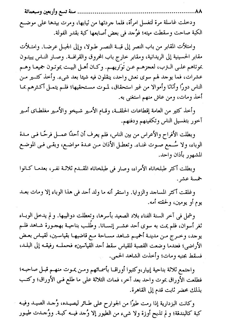 وَدخلت غاسلة مرّة لتغسل امْرَأَة فَلَمَّا جردتها من ثِيَابهَا وَمَرَّتْ بِيَدِهَا على مَوضِع الكبة صاحت وَسَقَطت ميته فَوجدَ فِي بعض أصابعها كبة بِقدر الفولة. وامتلأت الْمَقَابِر من بَاب النَّصْر إِلَى قبَّة النَّصْر طولا وَإِلَى الْجَبَل عرضا. وامتلأت مَقَابِر الحسينية إِلَى الريدانية ومقابر خَارج بَاب المحروق والقرافة. وَصَارَ النَّاس يبيتُونَ بموتاهم على الترب لعجزهم عَن تواريهم. وَكَانَ أهل الْبَيْت يموتون جَمِيعًا وهم عشرات فَمَا يُوجد لَهُم سوى نعش وَاحِد ينقلون فِيهِ شَيْئا بعد شَيْء. وَأخذ كثير من النَّاس دوراً وأثاثاً وأموالا من غير اسْتِحْقَاق لمَوْت مستحقيها فَلم يتمل أَكْثَرهم. مِمَّا أَخذ وَمَات وَمن عَاشَ مِنْهُم اسْتغنى بِهِ. وَأخذ كثير من الْعَامَّة إقطاعات الْحلقَة وَقَامَ الْأَمِير شيخو والأمير مغلطاي أَمِير آخور بتغسيل النَّاس وتكفينهم ودفنهم. وَبَطلَت الأفراح والأعراس من بَين النَّاس فَلم يعرف أَن أحدا عمل فَرحا فِي مُدَّة الوباء وَلَا سمع صَوت غناء. وتعطل الْأَذَان من عدَّة مَوَاضِع وَبَقِي فِي الْموضع الْمَشْهُور بِأَذَان وَاحِد. وَبَطلَت أَكثر طبلخاناه الْأُمَرَاء وَصَارَ فِي طبلخاناه الْمُقدم ثَلَاثَة نفر بَعْدَمَا كَانُوا خَمْسَة عشر. وغلقت أَكثر الْمَسَاجِد والزوايا. وَاسْتقر أَنه مَا ولد أحد فِي هَذَا الوباء إِلَّا وَمَات بعد يَوْم أَو يَوْمَيْنِ وَلَحِقتهُ أمه. وَشَمل فِي آخر السّنة الفناء بِلَاد الصَّعِيد بأسرها وتعطلت دواليبها. وَلم يدْخل الوباء ثغر أسوان فَلم يمت بِهِ سوى أحد عشر إنْسَانا. وَطلب بِنَاحِيَة بهجورة شَاهد فَلم يُوجد وَخرج من مَدِينَة أخميم شَاهد مساحة مَعَ قاضيها بقياسين لقياس بعض الْأَرَاضِي فعندما وضعت القصبة للْقِيَاس سقط أحد القياسين فَحَمله رَفِيقه إِلَى الْبَلَد فَسقط بجنبه وَمَات وَأخذت الشَّاهِد الْحمى. وَاجْتمعَ ثَلَاثَة بِنَاحِيَة أبيار وَكَتَبُوا أوراقاً بِأَسْمَائِهِمْ وَمن يَمُوت مِنْهُم قبل صَاحبه فطلعت الأوراق. بِمَوْت وَاحِد بعد آخر فَمَاتَ الثَّلَاثَة على مَا طلع فِي الأوراق وَكتب بذلك محْضر ثَابت قدم إِلَى الْقَاهِرَة. وَكَانَت البزداريه إِذا رمت طيراً من الْجَوَارِح على طَائِر ليصيده وجد الصَّيْد وَفِيه كبة كالبندقة وَلم تذبح أوزة وَلَا شَيْء من الطُّيُور إِلَّا وجد فِيهِ كبة. وَوجدت طيور