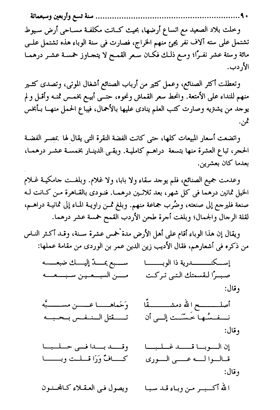 وخلت بِلَاد الصَّعِيد مَعَ اتساع أرْضهَا بِحَيْثُ كَانَت مكلفة مساحي أَرض سيوط تشْتَمل على سِتَّة آلَاف نفر يَجِيء مِنْهُم الْخراج فَصَارَت فِي سنة الوباء هَذِه تشْتَمل على مائَة وَسِتَّة عشر نَفرا وَمَعَ ذَلِك فَكَانَ سعر الْقَمْح لَا يتَجَاوَز خَمْسَة عشر درهما الأردب. وتعطلت أَكثر الصَّنَائِع وَعمل كثير من أَرْبَاب الصَّنَائِع أشغال الْمَوْتَى وتصدى كثير مِنْهُم للنداء على الْأَمْتِعَة. وانحط سعر القماش وَنَحْوه حَتَّى أبيع بِخمْس ثمنه وَأَقل وَلم يُوجد من يَشْتَرِيهِ وَصَارَت كتب الْعلم يُنَادى عَلَيْهَا بالأحمال فَيُبَاع الْحمل مِنْهَا بأبخس ثمن واتضعت أسعار المبيعات كلهَا حَتَّى كَانَت الْفضة النقرة الَّتِي يُقَال لَهَا. بِمصْر الْفضة الْحجر تبَاع الْعشْرَة مِنْهَا بِتِسْعَة دَرَاهِم كاملية. وَبَقِي الدِّينَار بِخَمْسَة عشر درهما بَعْدَمَا كَانَ بِعشْرين. وعدمت جَمِيع الصَّنَائِع فَلم يُوجد سقاء وَلَا بَابا وَلَا غُلَام. وَبَلغت جامكية غُلَام الْخَيل ثَمَانِينَ درهما فِي كل شهر بعد ثَلَاثِينَ درهما. فَنُوديَ بِالْقَاهِرَةِ من كَانَت لَهُ صَنْعَة فَليرْجع إِلَى صَنعته وَضرب جمَاعَة مِنْهُم. وَبلغ ثمن راوية المَاء إِلَى ثَمَانِيَة دَرَاهِم لقلَّة الرّحال وَالْجمال وَبَلغت أُجْرَة طحن الأردب الْقَمْح خَمْسَة عشر درهما. وَيُقَال إِن هَذَا الوباء أَقَامَ على أهل الأَرْض مُدَّة خمس عشرَة سنة وَقد أَكثر النَّاس من ذكره فِي أشعارهم فَقَالَ الأديب زين الدّين عمر بن الوردي من مقامة عَملهَا: إسكندرية ذَا الوبا سبع يمد إِلَيْك ضبعه صبرا لقسمتك الَّتِي تركت من السّبْعين سبعه وَقَالَ: أصلح الله دمشقاً وحماها عَن مسبه وَقَالَ: إِن الوبا قد غلبا وَقد بدا فِي حَلبًا قَالُوا لَهُ عي الورى كَاف ورا قلت وبا وَقَالَ: الله أكبر من وباء قد سبا ويصول فِي الْعُقَلَاء كَالْمَجْنُونِ
