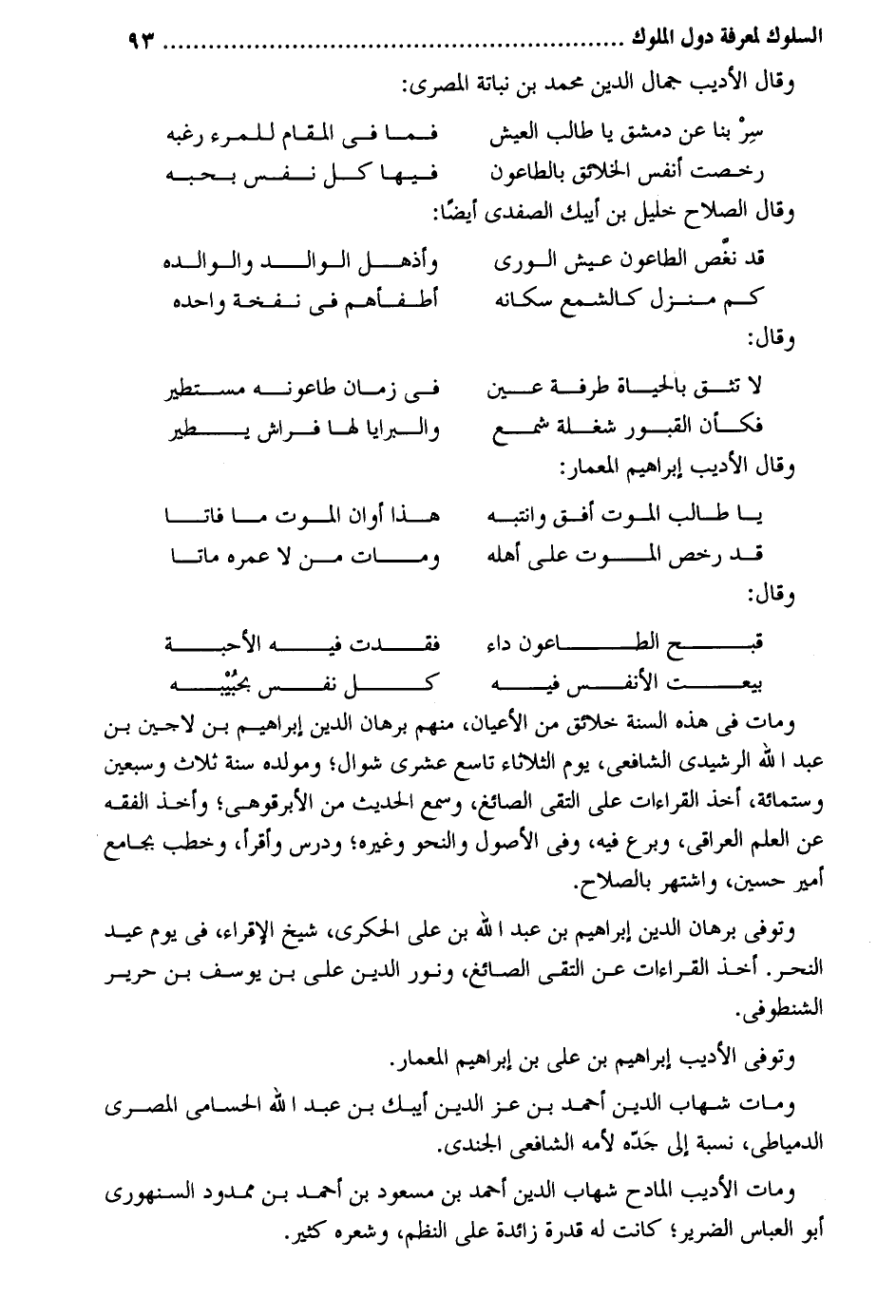 وَقَالَ الأديب جمال الدّين مُحَمَّد بن نباتة الْمصْرِيّ: سر بِنَا عَن دمشق ياطالب الْعَيْش فَمَا فِي الْمقَام للمرء رغبه رخصت أنفس الْخَلَائق بالطاعون فِيهَا كل نفس بحبه وَقَالَ الصّلاح خَلِيل بن أيبك الصَّفَدِي أَيْضا: قد نغص الطَّاعُون عَيْش الورى وأذهل الْوَالِد والوالده كم منزل كالشمع سكانه أطفأهم فِي نفخة واحده وَقَالَ: لَا تثق بِالْحَيَاةِ طرفَة عين فِي زمَان طاعونه مستطير فَكَأَن الْقُبُور شغلة شمع والبرايا لَهَا فرَاش يطير وَقَالَ الأديب إِبْرَاهِيم المعمار: يَا طَالب الْمَوْت أفق وانتبه هَذَا أَوَان الْمَوْت مَا فاتا قد رخص الْمَوْت على أَهله وَمَات من لَا عمره مَاتَا وَقَالَ: قبح الطَّاعُون دَاء فقدت فِيهِ الْأَحِبَّة وَمَات فِي هده السّنة خلائق من الْأَعْيَان مِنْهُم برهَان الدّين إِبْرَاهِيم بن لاجين بن عبد الله الرَّشِيدِيّ الشَّافِعِي يَوْم الثُّلَاثَاء تَاسِع عشري شَوَّال ومولده سنة ثَلَاث وَسبعين وسِتمِائَة أَخذ الْقرَاءَات على التقي الصَّائِغ وَسمع الحَدِيث من الأبرقوهي وَأخذ الْفِقْه عَن الْعلم الْعِرَاقِيّ وبرع فِيهِ وَفِي الْأُصُول والنحو وَغَيره ودرس وأقرأ وخطب بِجَامِع أَمِير حُسَيْن واشتهر بالصلاح. وَتُوفِّي برهَان الدّين إِبْرَاهِيم بن عبد الله بن عَليّ الحكري شيخ الإقراء فِي يَوْم عيد النَّحْر. أَخذ الْقرَاءَات عَن التقي الصَّائِغ وَنور الدّين عَليّ بن يُوسُف بن حَرِير الشنطوفي. وَتُوفِّي الأديب إِبْرَاهِيم بن عَليّ بن إِبْرَاهِيم المعمار. وَمَات شهَاب الدّين أَحْمد بن عز الدّين أيبك بن عبد الله الحسامي الْمصْرِيّ الدمياطي نِسْبَة إِلَى جده لأمه الشَّافِعِي الجندي. وَمَات الأديب المادح شهَاب الدّين أَحْمد بن مَسْعُود بن أَحْمد بن مَمْدُود السنهوري أَبُو الْعَبَّاس الضَّرِير كَانَت لَهُ قدرَة زَائِدَة على النّظم وشعره كثير.