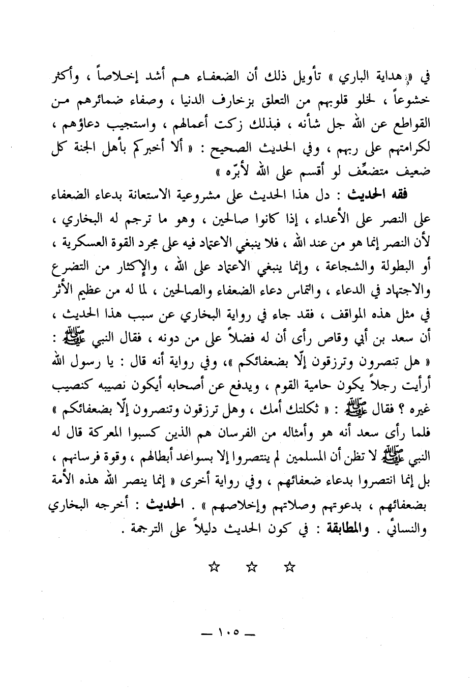 فقه الحديث: دل هذا الحديث على مشروعية الاستعانة بدعاء الضعفاء على النصر على الأعداء، إذا كانوا صالحين، وهو ما ترجم له البخاري، لأن النصر إنما هو من عند الله، فلا ينبغي الاعتماد فيه على مجرد القوة العسكرية، أو البطولة والشجاعة، وإنما ينبغي الاعتماد على الله، والإكثار من التضرع والاجتهاد في الدعاء، والتماس دعاء الضعفاء والصالحين، لما له من عظيم الأثر في مثل هذه المواقف، فقد جاء في رواية البخاري عن سبب هذا الحديث، أن سعد بن أبي وقاص رأى أن له فضلاً على من دونه، فقال النبي - صلى الله عليه وسلم -: " هل تنصرون وترزقون إلاّ بضعفائكم "، وفي رواية أنه قال: يا رسول الله أرأيت رجلاً يكون حامية القوم، ويدفع عن أصحابه أيكون نصيبه كنصيب غيره؟ فقال - صلى الله عليه وسلم -: " ثكلتك أمك، وهل ترزقون وتنصرون إلاّ بضعفائكم " فلما رأى سعد أنه هو وأمثاله من الفرسان هم الذين كسبوا المعركة قال له النبي - صلى الله عليه وسلم - لا تظن أن المسلمين لم ينتصروا إلا بسواعد أبطالهم، وقوة فرسانهم، بل إنما انتصروا بدعاء ضعفائهم، وفي رواية أخرى " إنما ينصر الله هذه الأمة بضعفائهم، بدعوتهم وصلاتهم وإخلاصهم ". الحديث: أخرجه البخاري والنسائي. والمطابقة: في كون الحديث دليلاً على الترجمة.