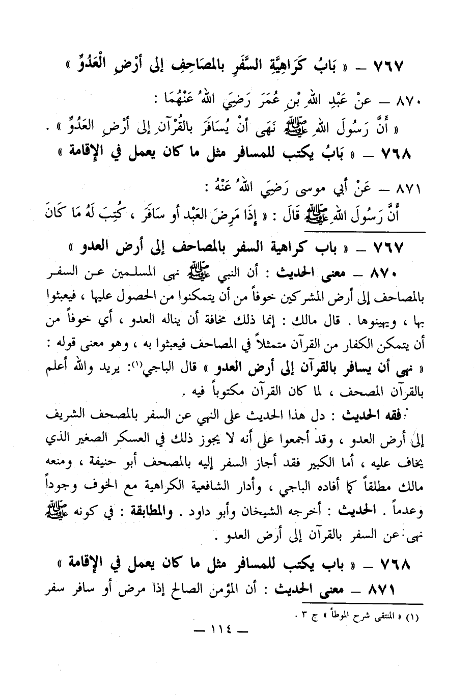 767 - " باب كراهية السفر بالمصاحف إلى أرض العدو "