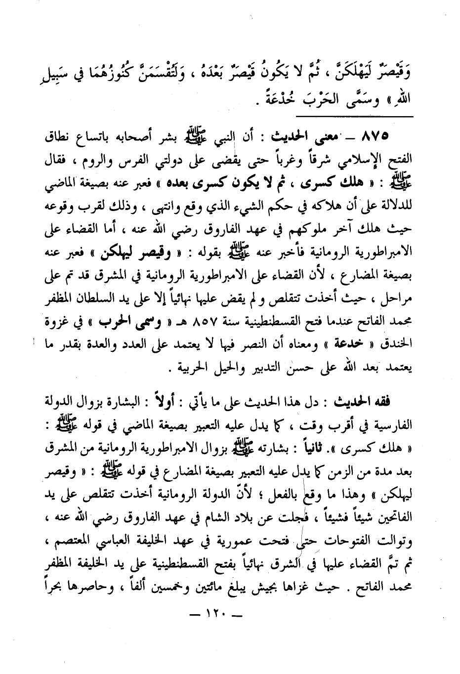 875 - "معنى الحديث: أن النبي - صلى الله عليه وسلم - بشر أصحابه باتساع نطاق الفتح الإسلامي شرقاً وغرباً حتى يفضى على دولتي الفرس والروم، فقال - صلى الله عليه وسلم -: " هلك كسرى، ثم لا يكون كسرى بعده " فعبر عنه بصيغة الماضي للدلالة على أن هلاكه في حكم الشيء الذي وقع وانتهى، وذلك لقرب وقوعه حيث هلك آخر ملوكهم في عهد الفاروق رضي الله عنه، أما القضاء على الامبراطورية الرومانية فأخبر عنه - صلى الله عليه وسلم - بقوله: " وقيصر ليهلكن " فعبر عنه بصيغة المضارع، لأن القضاء على الامبراطورية الرومانية في المشرق قد تم على مراحل، حيث أخذت تتقلص ولم يقض عليها نهائياً إِلا على يد السلطان المظفر محمد الفاتح عندما فتح القسططينية سنة 857 هـ " وسمى الحرب " في غزوة الخندق " خدعة " ومعناه أن النصر فيها لا يعتمد على العدد والعدة بقدر ما يعتمد بعد الله على حسن التدبير والحيل الحربية.