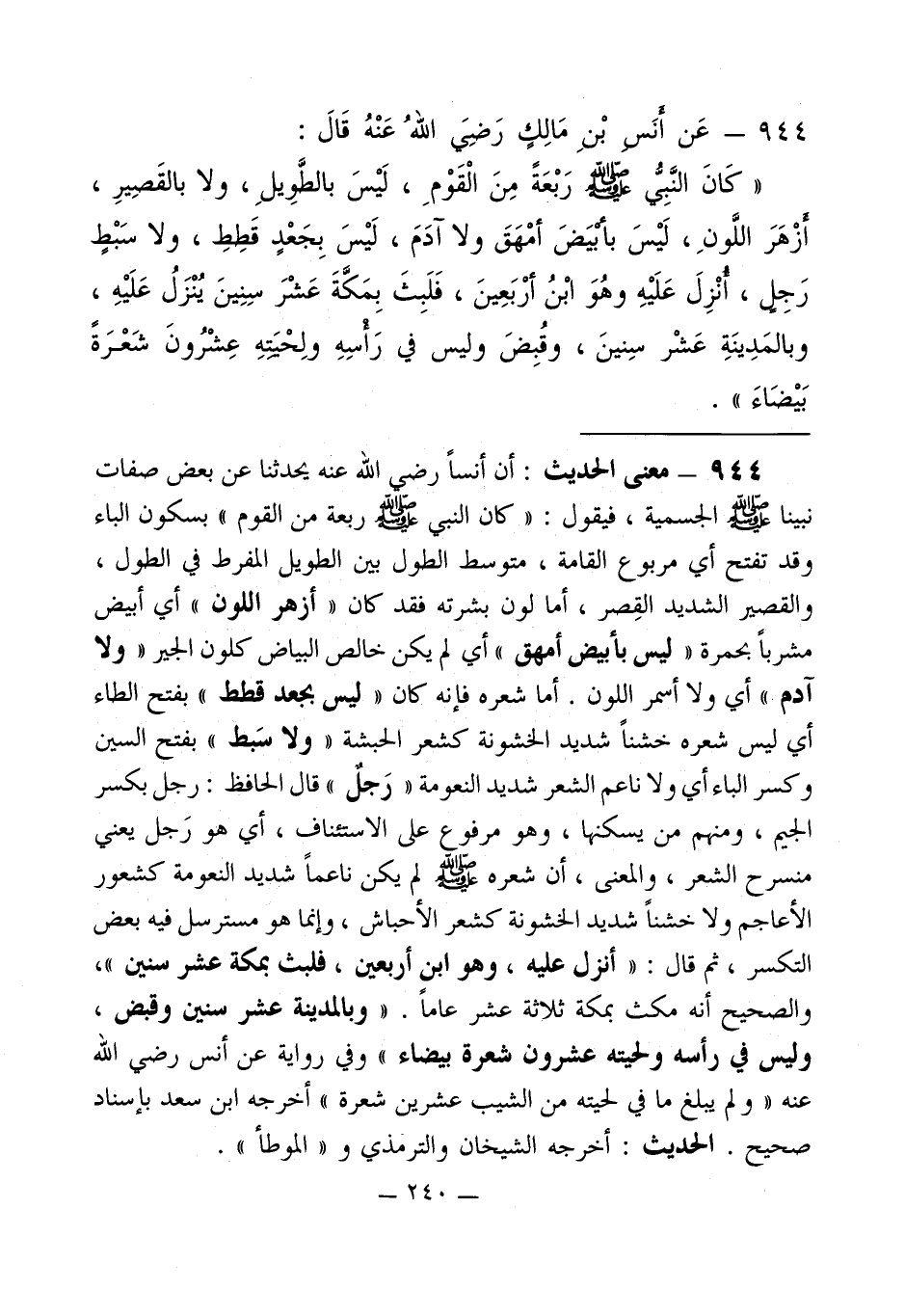 944 - معنى الحديث: أن أنساً رضي الله عنه يحدثنا عن بعض صفات نبينا - صلى الله عليه وسلم - الجسمية، فيقول: " كان النبي - صلى الله عليه وسلم - ربعة من القوم " بسكون الباء وقد تفتح أي مربوع القامة، متوسط الطول بين الطويل المفرط في الطول، والقصير الشديد القِصر، أما لون بشرته فقد كان " أزهر اللون " أي أبيض مشرباً بحمرة " ليس بأبيض أمهق " أي لم يكن خالص البياض كلون الجير " ولا آدم. " أي ولا أسمر اللون. أما شعره فإنه كان " ليس بجعد قطط " بفتح الطاء أي ليس شعره خشناً شديد الخشونة كشعر الحبشة " ولا سَبط " بفتح السين وكسر الباء أي ولا ناعم الشعر شديد النعومة " رَجلٌ " قال الحافظ: رجل بكسر الجيم، ومنهم من يسكنها، وهو مرفوع على الاستئناف، أي هو رَجل يعني منسرح الشعر، والمعنى، أن شعره - صلى الله عليه وسلم - لم يكن ناعماً شديد النعومة كشعور الأعاجم ولا خشناً شديد الخشونة كشعر الأحباش، وإنما هو مسترسل فيه بعض التكسر، ثم قال: " أنزل عليه، وهو ابن أربعين، فلبث بمكة عشر سنين "، والصحيح أنه مكث بمكة ثلاثة عشر عاماً. " وبالمدينه عشر سنين وقبض، وليس في رأسه ولحيته عشرون شعرة بيضاء " وفي رواية عن أنس رضي الله عنه " ولم يبلغ ما في لحيته من الشيب عشرين شعرة " أخرجه ابن سعد بإسناد صحيح. الحديث: أخرجه الشيخان والترمذي و" الموطأ ".