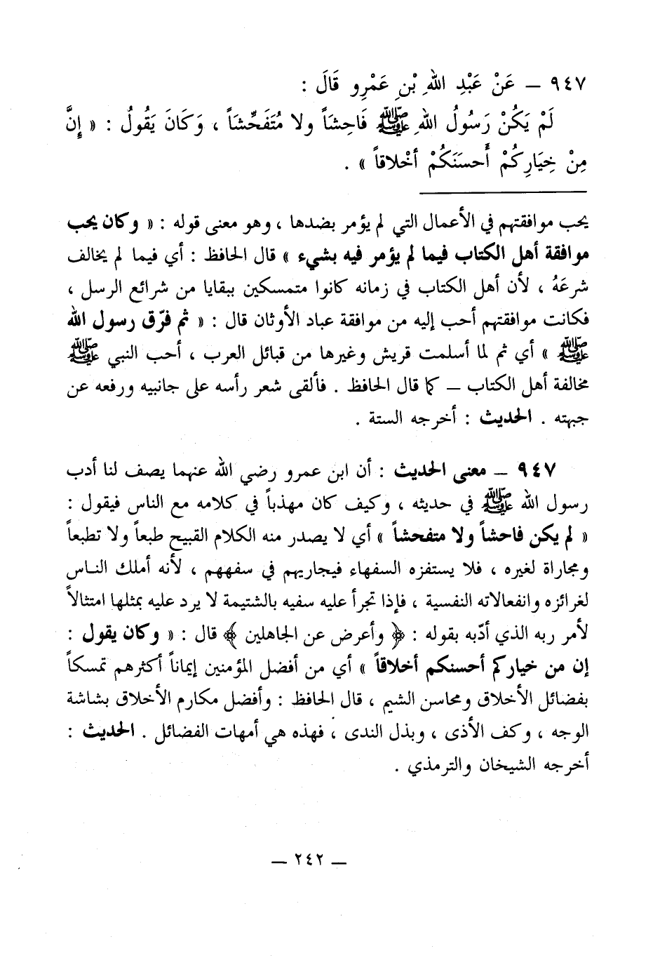 947 - معنى الحديث: أن ابن عمرو رضي الله عنهما يصف لنا أدب رسول الله - صلى الله عليه وسلم - في حديثه، وكيف كان مهذباً في كلامه مع الناس فيقول: " لم يكن فاحشاً ولا متفحشاً " أي لا يصدر منه الكلام القبيح طبعاً ولا تطبعاً ومجاراة لغيره، فلا يستفزه السفهاء فيجاريهم في سفههم، لأنه أملك الناس لغرائزه وانفعالاته النفسية، فإذا تجرأ عليه سفيه بالشتيمة لا يرد عليه بمثلها امتثالاً لأمر ربه الذي أدّبه بقوله: (وَأَعْرِضْ عَنِ الْجَاهِلِينَ) قال: " وكان يقول: إن من خياركم أحسنكم أخلاقاً " أي من أهل المؤمنين إيماناً أكثرهم تمسكاً بفضائل الأخلاق ومحاسن الشيم، قال الحافظ. وأفضل مكارم الأخلاق بشاشة الوجه، وكف الأذى، وبذل الندى، فهذه هي أمهات الفضائل. الحديث: أخرجه الشيخان والترمذي.