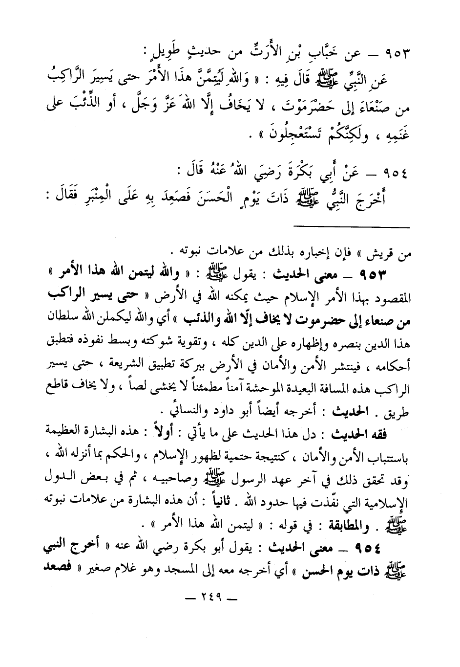 953 - معنى الحديث: يقول - صلى الله عليه وسلم -: " والله ليتمن الله هذا الأمر " المقصود بهذا الأمر الإِسلام حيث يمكنه الله في الأرض " حتى يسير الراكب من صنعاء إلى حضرموت لا يخاف إلاّ الله والذئب " أي والله ليكملن الله سلطان هذا الدين بنصره وإظهاره على الدين كله، وتقوية شوكته وبسط نفوذه فتطبق أحكامه، فينتشر الأمن والأمان في الأرض ببركة تطبيق الشريعة، حتى يسير الراكب هذه المسافة البعيدة الموحشة آمناً مطمئناً لا يخشى لصاً، ولا يخاف قاطع طريق. الحديث: أخرجه أيضاً أبو داود والنسائي.