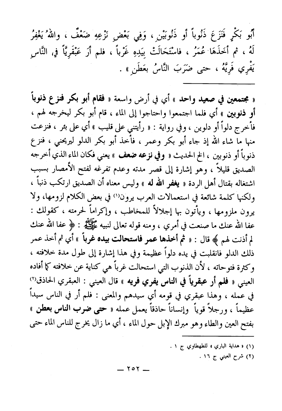أبو بَكْرٍ فَنَزَعَ ذَنُوباً أو ذَنُوبَيْنِ، وَفِى بَعْض نَزْعِهِ ضَعْفٌ، واللهُ يَغْفِرُ لَهُ، ثم أخَذَهَا عُمَرُ، فاسْتَحَالَتْ بِيَدِهِ غَرْباً، فلم أر عَبْقَرِيَّاً في النَّاسِ يَفْرِي فَرِيَّهُ، حتى ضَرَبَ النَّاسُ بعَطنِ".