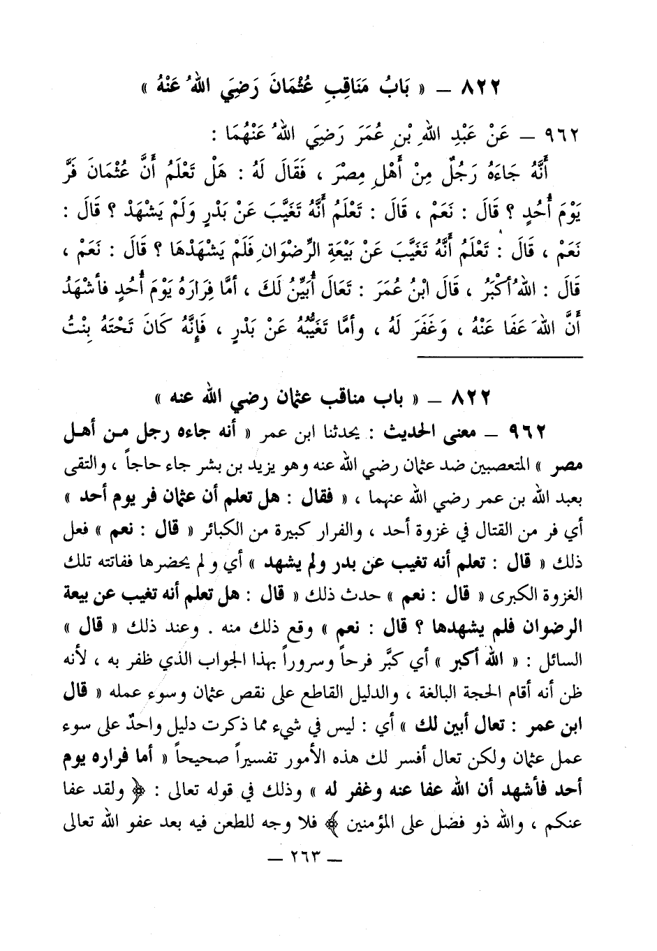962 - معنى الحديث: يحدثنا ابن عمر " أنه جاءه رجل من أهل مصر " المتعصبين ضد عثمان رضي الله عنه وهو يزيد بن بشر جاء حاجاً، والتقى بعبد الله بن عمر رضي الله عنهما، " فقال: هل تعلم أن عثمان فر يوم أحد " أي فر من القتال في غزوة أحد، والفرار كبيرة من الكبائر " قال: نعم " فعل ذلك " قال: تعلم أنه تغيب عن بدر ولم يشهد " أي ولم يحضرها ففاتته تلك الغزوة الكبرى " قال: نعم " حدث ذلك " قال: هل تعلم أنه تغيب عن بيعة الرضوان فلم يشهدها؟ قال: نعم " وقع ذلك منه. وعند ذلك " قال " السائل: " الله أكبر " أي كبَّر فرحاً وسروراً بهذا الجواب الذي ظفر به، لأنه ظن أنه أقام الحجة البالغة، والدليل القاطع على نقص عثمان وسوء عمله " قال ابن عمر: تعال أبين لك " أي: ليس في شيء مما ذكرت دليل واحدٌ على سوء عمل عثمان ولكن تعال أفسر لك هذه الأمور تفسيراً صحيحاً " أما فراره يوم أحد فأشهد أن الله عفا عنه وغفر له " وذلك في قوله تعالى: (وَلَقَدْ عَفَا عَنْكُمْ وَاللَّهُ ذُو فَضْلٍ عَلَى الْمُؤْمِنِينَ) فلا وجه للطعن فيه بعد عفو الله تعالى