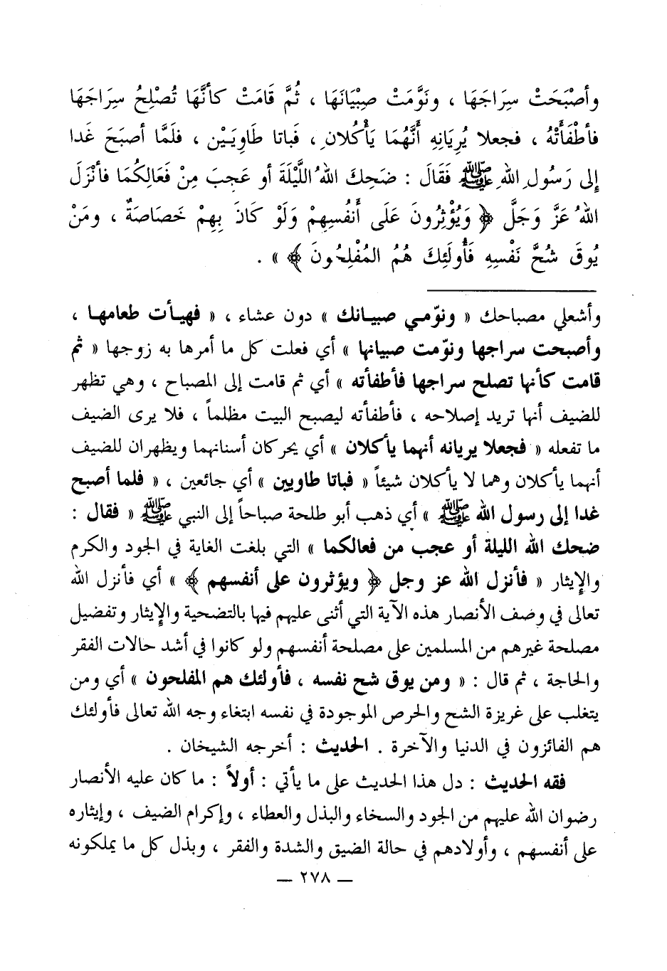 وأشعلي مصباحك "ونوّمي صبيانك" دون عشاء، " فهيأت طعامها، وأصبحت سراجها ونوّمت صبيانها " أي فعلت كل ما أمرها به زوجها " ثم قامت كأنها تصلح سراجها فأطفأته " أي ثم قامت إلى المصباح، وهي تظهر للضيف أنها تريد إصلاحه، فأطفأته ليصبح البيت مظلماً، فلا يرى الضيف ما تفعله " فجعلا يريانه أنهما يأكلان " أي يحركان أسنانهما ويظهران للضيف أنهما يأكلان وهما لا يأكلان شيئاً " فباتا طاويين " أي جائعين، " فلما أصبح غدا إلى رسول الله - صلى الله عليه وسلم - " أي ذهب أبو طلحة صباحاً إلى النبي - صلى الله عليه وسلم - " فقال: ضحك الله الليلة أو عجب من فعالكما " التي بلغت الغاية في الجود والكرم والإيثار " فأنزل الله عز وجل (وَيُؤْثِرُونَ عَلَى أَنْفُسِهِمْ) " أي فأنزل الله تعالى في وصف الأنصار هذه الآية التي أثنى عليهم فيها بالتضحية والإِيثار وتفضيل مصلحة غيرهم من المسلمين على مصلحة أنفسهم ولو كانوا في أشد حالات الفقر والحاجة، ثم قال: "ومن يوق شح نفسه، فأولئك هم المفلحون " أي ومن يتغلب على غريزة الشح والحرص الموجودة في نفسه ابتغاء وجه الله تعالى فأولئك هم الفائزون في الدنيا والآخرة. الحديث: أخرجه الشيخان.