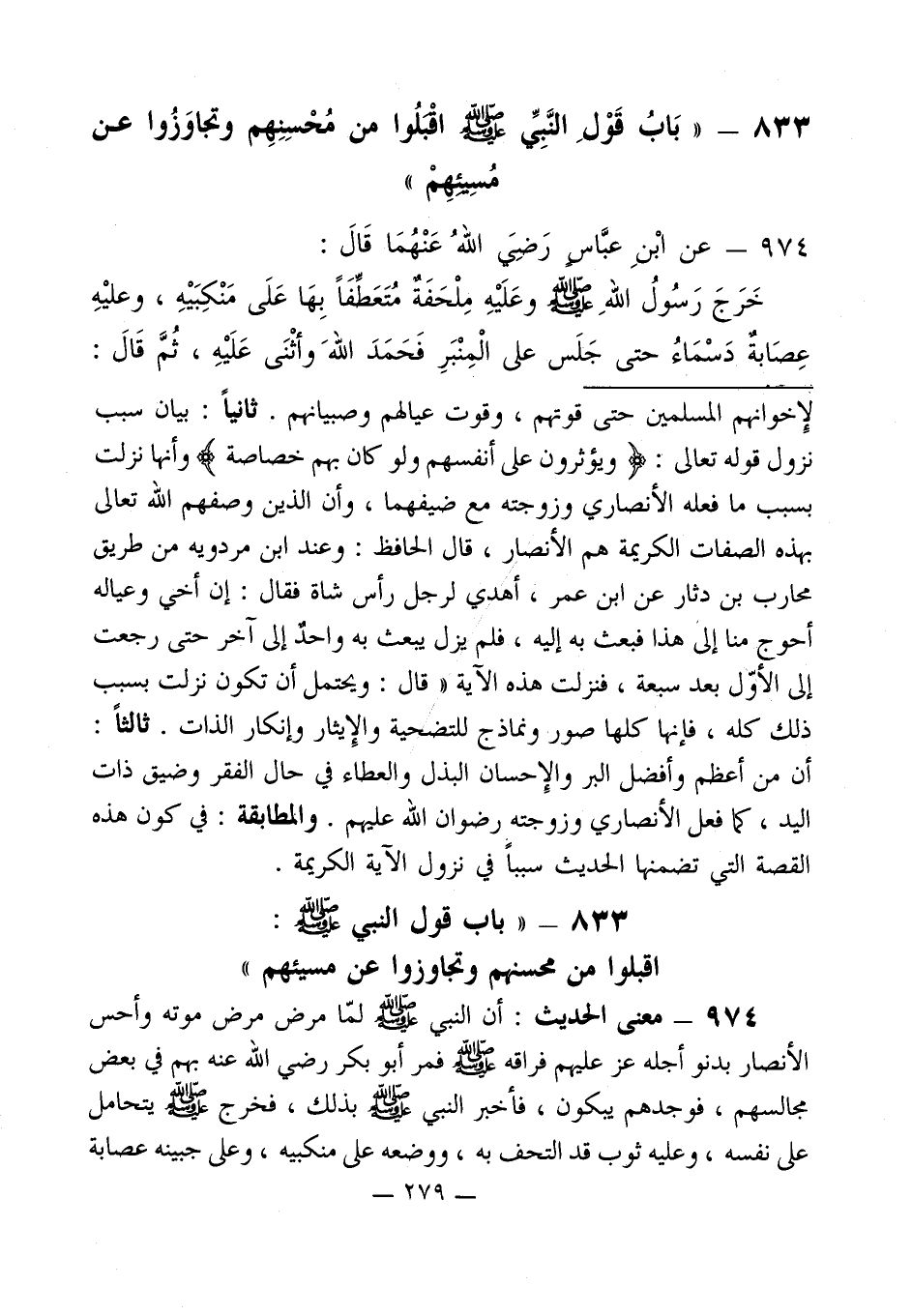 833 - " باب قول النبي - صلى الله عليه وسلم -: اقبلوا من محسنهم وتجاوزوا عن مسيئهم "