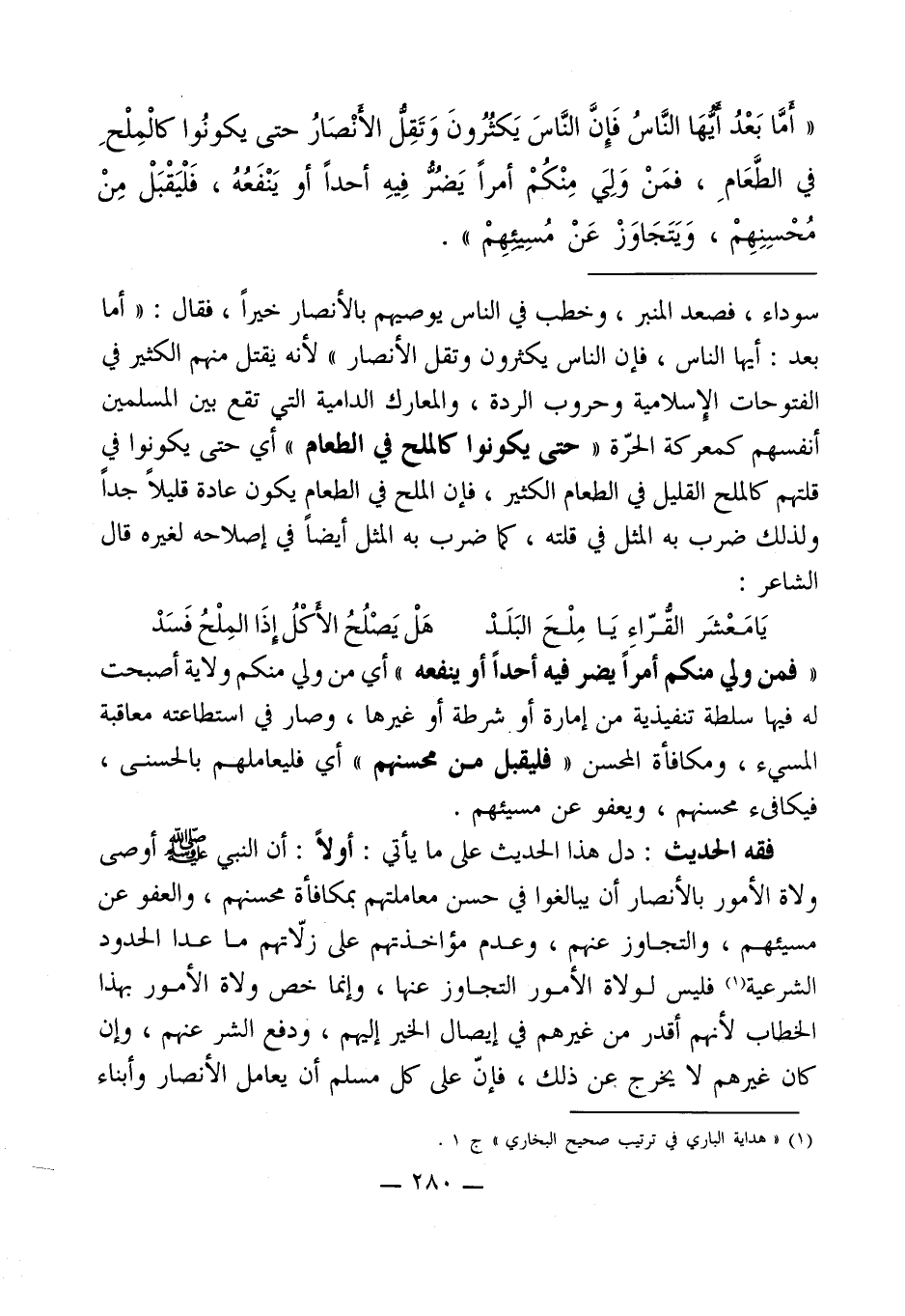 " أمَّا بَعْدُ أيّهَا النَّاسُ فَإِنَّ النَّاسَ يَكثُرُونَ وَتَقِلُّ الأنْصَارُ حتى يكونُوا كالْمِلْح في الطَّعَامِ، فمَنْ وَلِيَ مِنْكُمْ أمراً يَضُرُّ فِيهِ أحداً أو يَنْفَعُهُ، فَلْيَقْبَلْ مِنْ مُحْسِنِهِمْ، وَيَتَجَاوَزْ عَنْ مُسِيئهِمْ ".