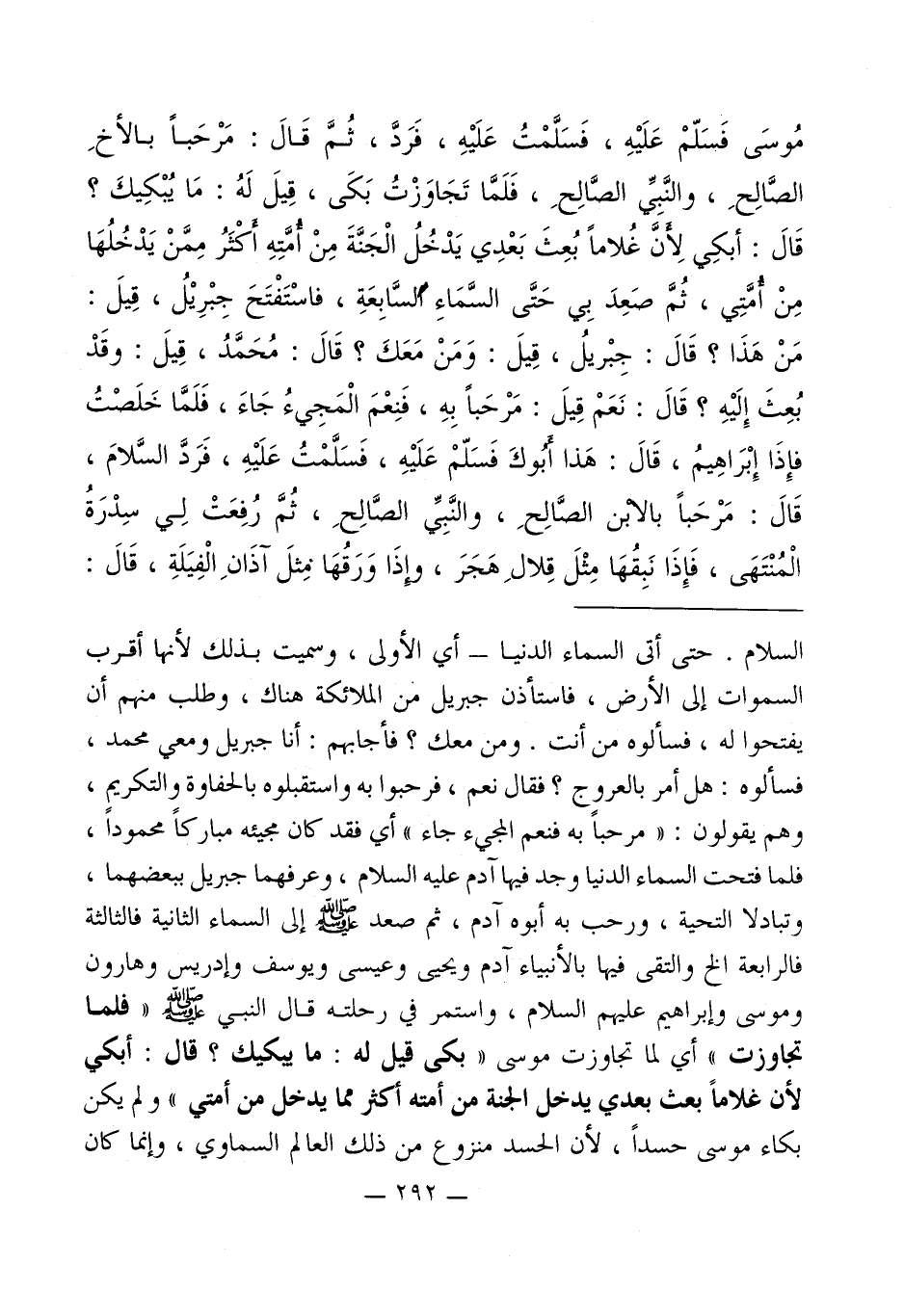 مُوسَى فَسَلّمْ عَلَيْهِ، فَسَلَّمْتُ عَلَيْهِ، فَرَدَّ، ثُمَّ قَالَ: مَرْحَباً بالأخ الصَّالِحِ، والنَّبِيِّ الصَّالِحِ، فَلَمَّا تَجَاوَزْتُ بَكَى، قِيلَ لَهُ. مَا يُبْكِيكَ؟ قَالَ: أبكِي لأنَّ غُلاماً بُعِثَ بَعْدِي يَدْخُلُ الْجَنَّةَ مِنْ أمَّتِهِ أكثَرُ مِمَّنْ يَدْخُلُهَا مِنْ أمَّتِي، ثُمَّ صَعِدَ بِي حَتَّى السَّمَاءِ السَّابِعَةِ، فاسْتَفْتَحَ جِبْرِيْلُ، قِيلَ: مَنْ هَذَا؟ قَالَ: جِبْريلُ، قِيلَ: وَمَنْ مَعَكَ؟ قَالَ: مُحَمَّدُ، قِيلَ: وقَدْ بُعِثَ إِلَيْهِ؟ قَالَ: نَعَمْ قِيلَ: مَرْحَباً بِهِ، فَنِعْمَ الْمَجِيءُ جَاءَ، فَلَمَّا خَلصْتُ فإِذَا إِبْرَاهِيمُ، قَالَ: هَذا أبوكَ فَسَلّمْ عَلَيْهِ، فَسَلَّمْتُ عَلَيْهِ، فَرَدَّ السَّلامَ، قَالَ: مَرْحَباً بالابن الصَّالِحِ، والنَّبِيِّ الصَّالِحِ، ثُمَّ رُفِعَتْ لِي سِدْرَةُ الْمُنْتَهَى، فَإِذَا نَبِقُهَا مِثْلَ قِلالِ هَجَرَ، وِإذَا وَرَقُهَا مِثلَ آذَانِ الْفِيَلَةِ، قَالَ: