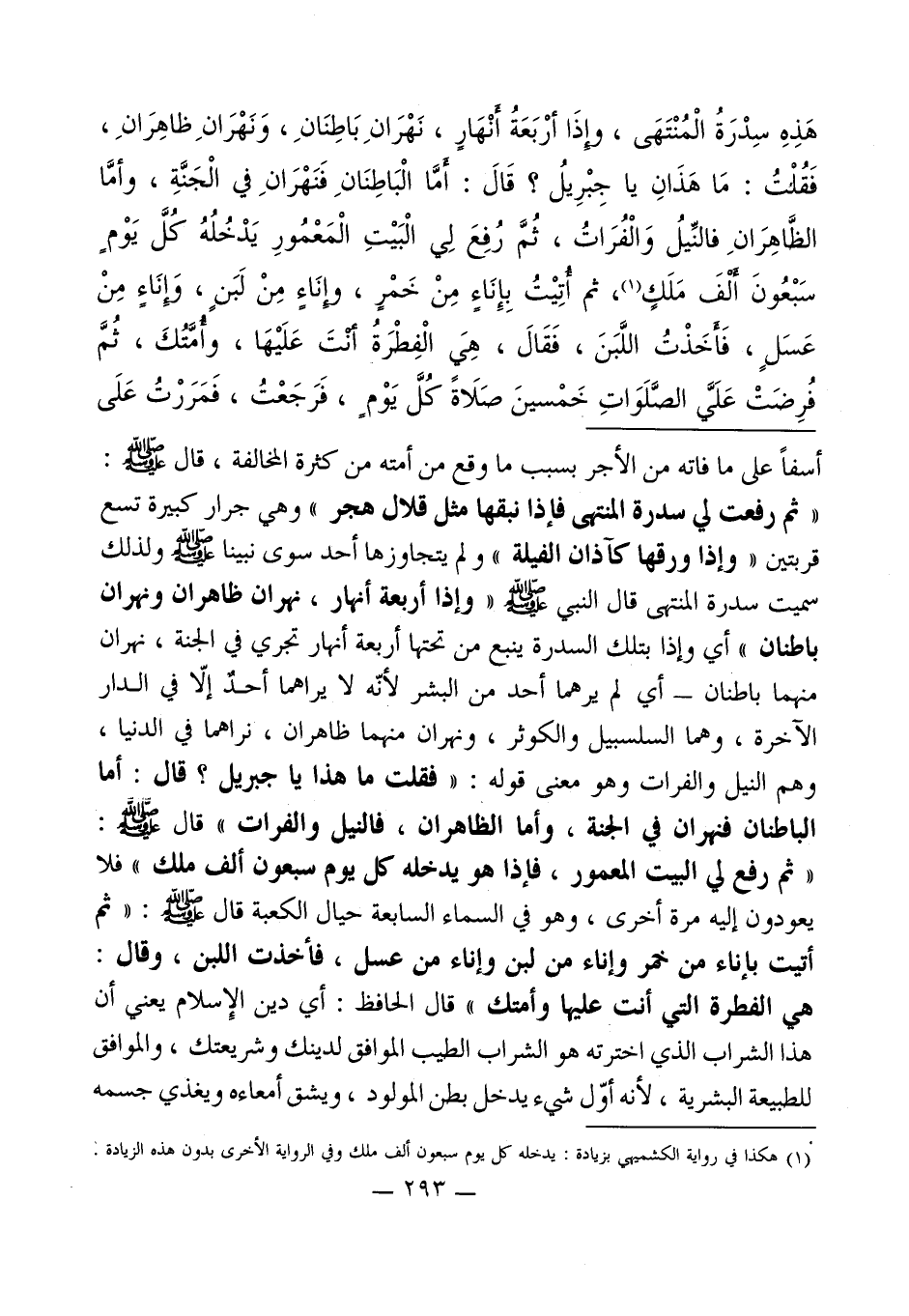 هَذِهِ سِدْرَةُ الْمُنْتَهَى، وِإذَا أرْبَعَةُ أنْهَارٍ، نَهْرَانِ بَاطِنَانِ، وَنَهْرَانِ ظاهِرَانِ، فَقُلْتُ: مَا هَذَانِ يا جِبْرِيلُ؟ قَالَ: أما الْبَاطِنَانِ فَنَهْرَانِ في الْجَنَّةِ، وأمَّا الظَّاهِرَانِ فالنِّيلُ وَالْفُرَاتُ، ثُمَّ رُفِعَ لِي الْبَيْتِ الْمَعْمُورِ يَدْخُلُهُ كُلَّ يَوْمٍ سَبْعُونَ ألفَ مَلَكٍ (¬1)، ثم أُتِيْتُ بِإِنَاءٍ مِنْ خَمْرٍ، وإنَاءٍ مِنْ لَبَن، وَإنَاءٍ مِنْ عَسَلٍ، فَأخَذْت اللَّبَنَ، فَقَالَ، هِيَ الْفِطرةُ أنْتَ عَلَيْهَا، وأمَّتكَ، ثُمَّ فُرِضَتْ عَلَيَّ الصَّلَوَاتِ خَمْسينَ صَلَاةً كُلَّ يَوْم، فَرَجَعْت، فَمَرَرْتُ عَلَى