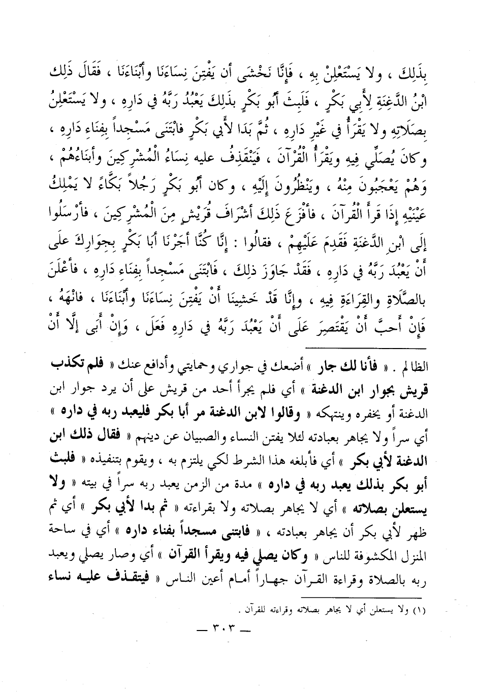 الظالم. " فأنا لك جار " أضعك في جواري وحمايتي وأدافع عنك " فلم تكذب قريش بجوار ابن الدغنة " أي فلم يجرأ أحد من قريش على أن يرد جوار ابن الدغنة أو يخفره وينتهكه " وقالوا لابن الدغنة مر أبا بكر فليعبد ربه في داره " أي سراً ولا يجاهر بعبادته لئلا يفتن النساء والصبيان عن دينهم " فقال ذلك ابن الدغنه لأبي بكر " أي فأبلغه هذا الشرط لكي يلتزم به، ويقوم بتنفيذه " فلبث أبو بكر بذلك يعبد ربه في داره " مدة من الزمن يعبد ربه سراً في بيته " ولا يستعلن بصلاته " أي لا يجاهر بصلاته ولا بقراءته " ثم بدا لأبي بكر " أي ثم ظهر لأبي بكر أن يجاهر بعبادته، " فابتنى مسجداً بفناء داره " أي في ساحة المنزل المكشوفة للناس " وكان يصلي فيه ويقرأ القرآن " أي وصار يصلي ويعبد ربه بالصلاة وقراءة القرآن جهاراً أمام أعين الناس "فيتقذف عليه نساء