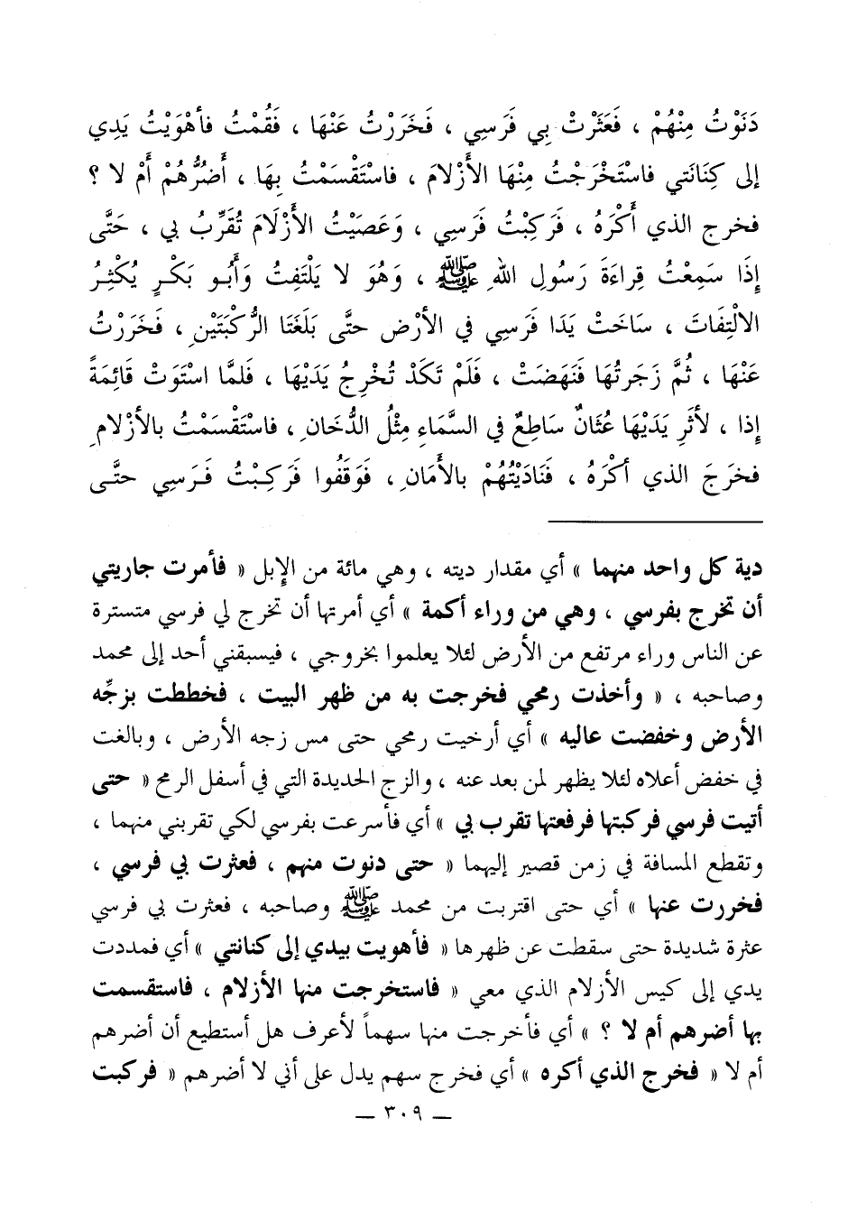 دية كل واحد منهما" أي مقدار ديته، وهي مائة من الإِبل " فأمرت جاريتي أن تخرج بفرسي، وهي من وراء أكمة " أي أمرتها أن تخرج لي فرسي متسترة عن الناس وراء مرتفع من الأرض لئلا يعلموا بخروجي، فيسبقني أحد إلى محمد وصاحبه، " وأخذت رمحي فخرجت به من ظهر البيت، فخططت بزجِّه الأرض وخفضت عاليه " أي أرخيت رمحي حتى مس زجه الأرض، وبالغت في خفض أعلاه لئلا يظهر لمن بعد عنه، والزج الحديدة التي في أسفل الرمح " حتى أتيت فرسي فركبتها فرفعتها تقرب بي " أي فأسرعت بفرسي لكي تقربني منهما، وتقطع المسافة في زمن قصير إليهما " حتى دنوت منهم، فعثرت بي فرسي، فخررت عنها " أي حتى اقتربت من محمد - صلى الله عليه وسلم - وصاحبه، فعثرت في فرسي عثرة شديدة حتى سقطت عن ظهرها " فأهويت بيدي إلى كنانتي " أي فمددت يدي إلى كيس الأزلام الذي معي " فاستخرجت منها الأزلام، فاستقسمت بها أضرهم أم لا؟ " أي فأخرجت منها سهماً لأعرف هل أستطيع أن أضرهم أم لا " فخرج الذي أكره " أي فخرج لسهم يدل على أني لا أضرهم "فركبت