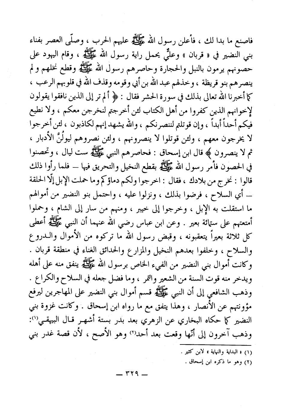 فاصنع ما بدا لك، فأعلن رسول الله - صلى الله عليه وسلم - عليهم الحرب، وصلّى العصر بفناء بني النضير في " قربان " وعليٌّ يحمل راية رسول الله - صلى الله عليه وسلم -، وقام اليهود على حصونهم يرمون بالنبل والحجارة وحاصرهم رسول الله - صلى الله عليه وسلم - وقطع نخلهم ولم ينصرهم بنو قريظة، وخذلهم عبد الله بن أبي وقومه وقذف الله في قلوبهم الرعب، كما أخبرنا الله تعالى بذلك في سورة الحشر فقال: (أَلَمْ تَرَ إِلَى الَّذِينَ نَافَقُوا يَقُولُونَ لِإِخْوَانِهِمُ الَّذِينَ كَفَرُوا مِنْ أَهْلِ الْكِتَابِ لَئِنْ أُخْرِجْتُمْ لَنَخْرُجَنَّ مَعَكُمْ وَلَا نُطِيعُ فِيكُمْ أَحَدًا أَبَدًا وَإِنْ قُوتِلْتُمْ لَنَنْصُرَنَّكُمْ وَاللَّهُ يَشْهَدُ إِنَّهُمْ لَكَاذِبُونَ (11) لَئِنْ أُخْرِجُوا لَا يَخْرُجُونَ مَعَهُمْ وَلَئِنْ قُوتِلُوا لَا يَنْصُرُونَهُمْ وَلَئِنْ نَصَرُوهُمْ لَيُوَلُّنَّ الْأَدْبَارَ ثُمَّ لَا يُنْصَرُونَ) قال ابن إسحاق: فحاصرهم النبي - صلى الله عليه وسلم - ست ليال، وتحصنوا في الحصون فأمر رسول الله - صلى الله عليه وسلم - بقطع النخيل والتحريق فيها -فلما رأوا ذلك قالوا: نخرج من بلادك، فقال: اخرجوا ولكم دماؤكم وما حملت الإِبل إلاّ الحلقة- أي السلاح، فرضوا بذلك، ونزلوا عليه، واحتمل بنو النضير من أموالهم ما استقلت به الإِبل، وخرجوا إلى خيبر، ومنهم من سار إلى الشام، وحملوا أمتعتهم على ستمائة بعير. وعن ابن عباس رضي الله عنهما أن النبي - صلى الله عليه وسلم - أعطى كل ثلاثة بعيراً يتعقبونه، وقبض رسول الله ما تركوه من الأموال والدروع والسلاح، وخلفوا بعدهم النخيل والمزارع والحدائق الغناء في منطقة قربان. وكانت أموال بني النضير من الفيء الخاص برسول الله - صلى الله عليه وسلم - ينفق منه على أهله ويدخر منه قوت السنة من الشعير والتمر، وما فضل جعله في السلاح والكراع. وذهب الشافعي إلى أن النبي - صلى الله عليه وسلم - قسم أموال بني النضير على المهاجرين ليرفع مؤونتهم عن الأنصار، وهذا يتفق مع ما رواه ابن إسحاق. وكانت غزوة بني النضير كما حكاه البخاري عن الزهرى بعد بدر بستة أشهر قال البيهقي (¬1): وذهب آخرون إلى أنّها وقعت بعد أحد (¬2) وهو الأصح، لأن قصة غدر بني