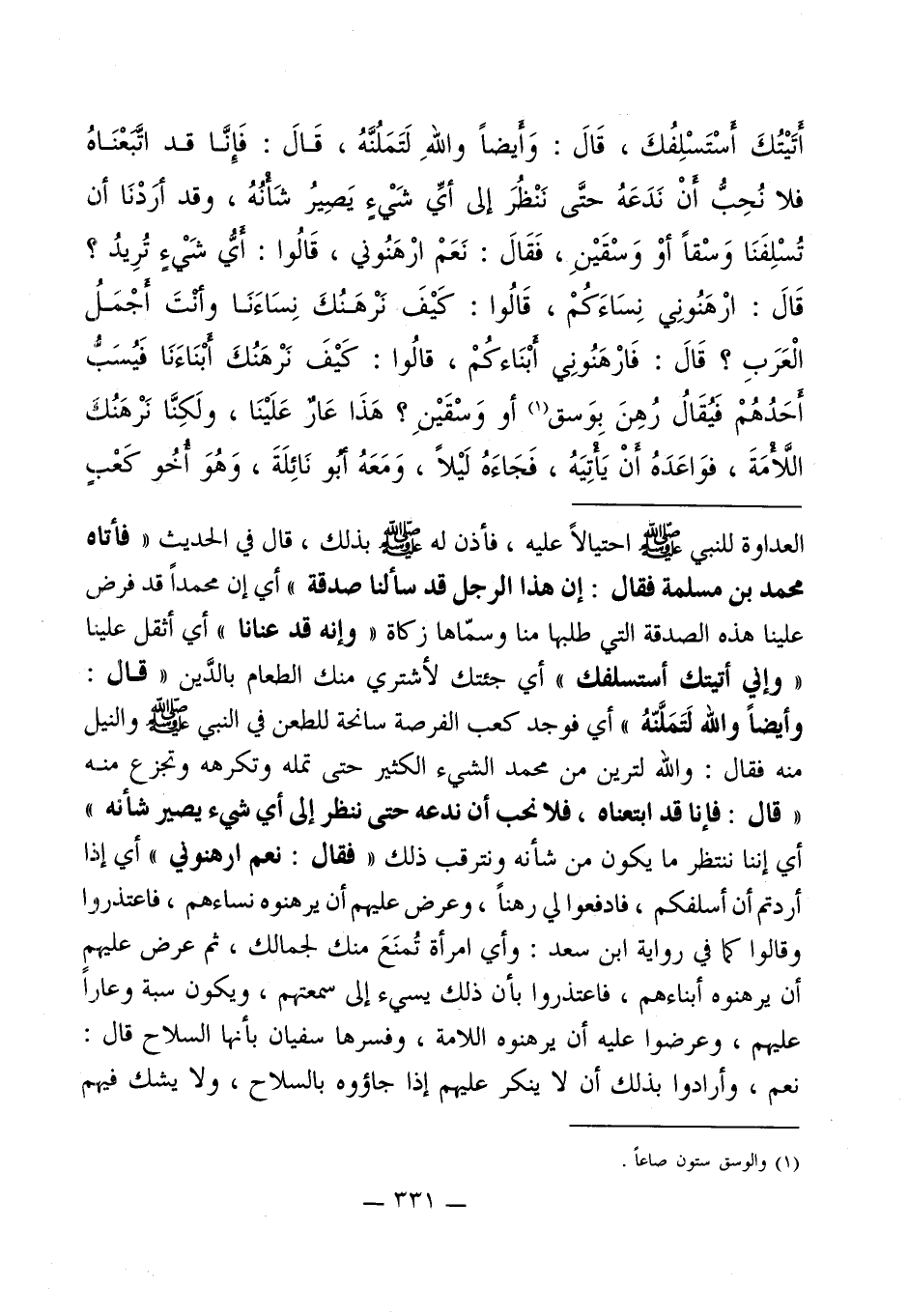 العداوة للنبي - صلى الله عليه وسلم - احتيالاً عليه، فأذن له - صلى الله عليه وسلم - بذلك، قال في الحديث " فأتاه محمد بن مسلمة فقال: إن هذا الرجل قد سألنا صدقة " أي إن محمداً قد فرض علينا هذه الصدقة التي طلبها منا وسمّاها زكاة " وإنه قد عنانا " أي أثقل علينا " وإني أتيتك أستسلفك " أي جئتك لأشتري منك الطعام بالدَّين " قال: وأيضاً والله لتملَّنّهُ " أي فوجد كعب الفرصة سانحة للطعن في النبي - صلى الله عليه وسلم - والنيل منه فقال: والله لترين من محمد الشيء الكثير حتى تمله وتكرهه وتجزع منه " قال: فإنا قد ابتعناه، فلا نحب أن ندعه حتى ننظر إلى أي شيء يصير شأنه " أي إننا ننتظر ما يكون من شأنه ونترقب ذلك " فقال: نعم ارهنوني " أي إذا أردتم أن أسلفكم، فادفعوا لي رهناً، وعرض عليهم أن يرهنوه نساءهم، فاعتذروا وقالوا كما في رواية ابن سعد: وأي امرأة تُمنَعَ منك لجمالك، ثم عرض عليهم أن يرهنوه أبناءهم، فاعتذروا بأن ذلك يسيء إلى سمعتهم، ويكون سبة وعاراً عليهم، وعرضوا عليه أن يرهنوه اللامة، وفسرها سفيان بأنها السلاح قال: نعم، وأرادوا بذلك أن لا ينكر عليهم إذا جاؤوه بالسلاح، ولا يشك فيهم