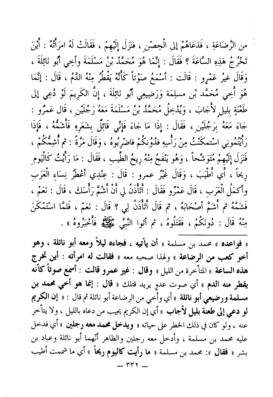 من الرَّضَاعَةِ، فَدَعَاهُمْ إلى الْحِصْنِ، فنَزَلَ إِلَيْهِمْ، فَقَالَتْ لَهُ امرَأتُهُ: أيْنَ تَخْرُجُ هَذِهِ السَّاعَةَ؟ فَقَالَ: إِنَّمَا هُوَ مُحَمَّدُ بْنُ مَسْلَمَةَ وأخِي أبو نَائِلَةَ، وَقَالَ غيرُ عَمْرو: قَالَت: أسْمَعُ صَوْتاً كَأنَّهُ يَقْطرٌ مِنْهُ الدَّمُ، قَالَ: إنَّمَا هُوَ أخِي مُحَمَّد بْن مسلِمَة وَرَضِيعِي أبو نَائِلَةَ، إِنَّ الكَرِيمَ لَوْ دُعِي إلى طَعْنَةٍ بِليل لأجَابَ، وَيُدْخِلُ مُحَمَّدُ بْنُ مَسْلَمَةَ مَعَهُ رَجُلَيْنِ، قَال عَمرو: جَاءَ مَعَهُ بِرَجُلَيْنِ، فَقَالَ: إذَا مَا جَاءَ فَإِنِّي قَائِل بِشَعَرِهِ فَأشَمُّهُ، فَإِذَا رَأيْتُمُونِي استمكَنْتُ مِنْ رَأسِهِ فدُوُنكُمْ فاضْرِبُوهُ، وَقَالَ مَرَّةً: ثم أُشِمُّكُمْ، فَنَزَلَ إِلَيْهِمْ مُتَوَشِّحاً، وَهُو يَنْفَحُ مِنْهُ رِيحُ الطِّيبِ، فَقَالَ: مَا رَأيتُ كَالْيَومِ رِيحاً، أي أطْيَبَ، وَقَالَ غَيْرُ عمرو: قَالَ: عِنْدِي أعْطرُ نِسَاءِ الْعَرَبِ وأكمَلُ الْعَرَبِ، قَالَ عَمْروٌ فَقَالَ: أتَأذَنُ لي أنْ أشُمَّ رَأسَكَ، قَالَ: نَعَمْ، فَشَمَّهُ ثم أشَمَّ أصْحَابَهُ، ثم قَالَ أتَأذَنُ لِي؟ قَالَ: نَعَمْ، فَلمَّا اسْتَمْكَنَ مِنْهُ قَالَ: دُونَكُمْ، فَقَتَلُوهُ، ثم أتوا النبي - صلى الله عليه وسلم - فَأخبَرُوهُ".