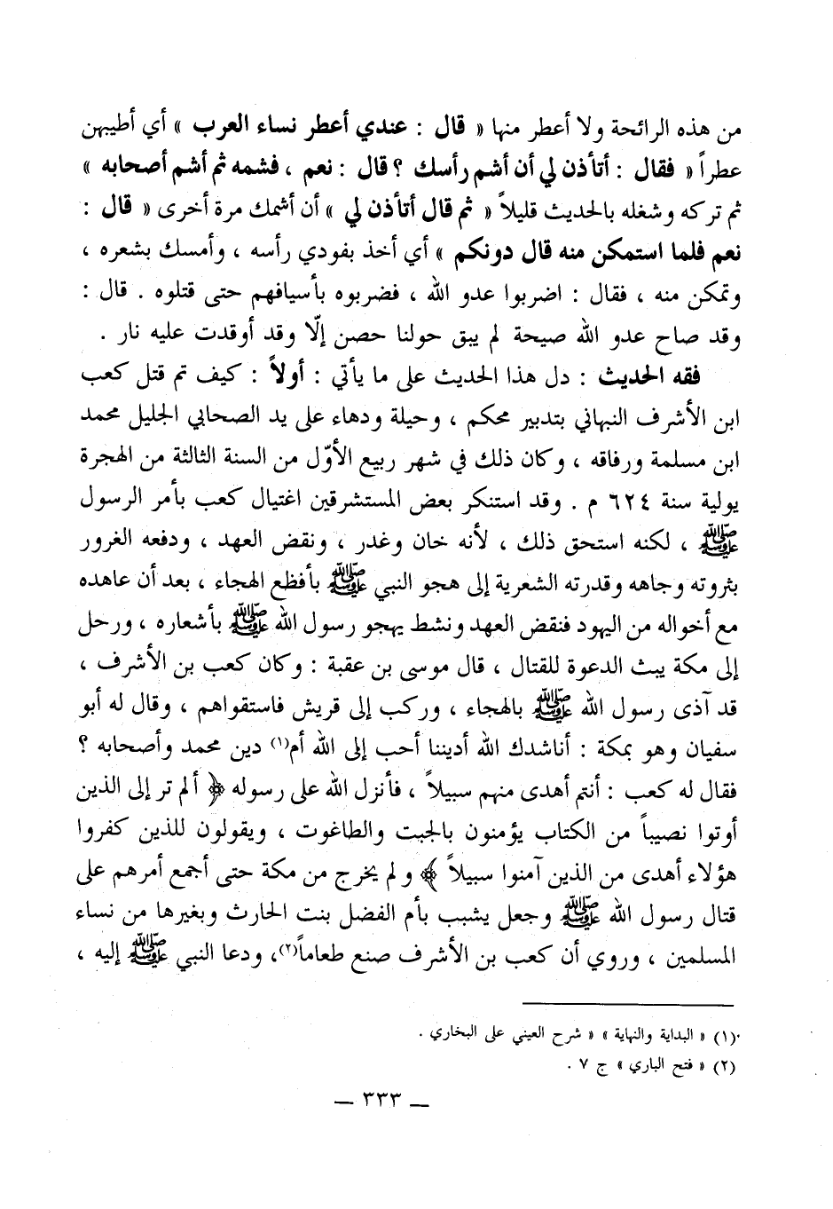 فقه الحديث: دل هذا الحديث على ما يأتي: أولاً: كيف تم قتل كعب ابن الأشرف النبهاني بتدبير محكم، وحيلة ودهاء على يد الصحابي الجليل محمد ابن مسلمة ورفاقه، وكان ذلك في شهر ربيع الأوّل من السنة الثالثة من الهجرة يولية سنة 624 م. وقد أستنكر بعض المستشرقين اغتيال كعب بأمر الرسول - صلى الله عليه وسلم -، لكنه استحق ذلك، لأنه خان وغدر، ونقض العهد، ودفعه الغرور بثروته وجاهه وقدرته الشعرية إلى هجو النبي - صلى الله عليه وسلم - بأفظع الهجاء، بعد أن عاهده مع أخواله من اليهود فنقض العهد ونشط يهجو رسول الله - صلى الله عليه وسلم - بأشعاره، ورحل إلى مكة يبث الدعوة للقتال، قال موسى بن عقبة: وكان كعب بن الأشرف، قد آذى رسول الله - صلى الله عليه وسلم - بالهجاء، وركب إلى قريش فاستقواهم، وقال له أبو سفيان وهو بمكة: أناشدك الله أديننا أحب إلى الله أم (¬1) دين محمد وأصحابه؟ فقال له كعب: أنتم أهدى منهم سبيلاً، فأنزل الله على رسوله (أَلَمْ تَرَ إِلَى الَّذِينَ أُوتُوا نَصِيبًا مِنَ الْكِتَابِ يُؤْمِنُونَ بِالْجِبْتِ وَالطَّاغُوتِ وَيَقُولُونَ لِلَّذِينَ كَفَرُوا هَؤُلَاءِ أَهْدَى مِنَ الَّذِينَ آمَنُوا سَبِيلًا) ولم يخرج من مكة حتى أجمع أمرهم على قتال رسول الله - صلى الله عليه وسلم - وجعل يشبب بأم الفضل بنت الحارث وبغيرها من نساء المسلمين، وروي أن كعب بن الأشرف صنع طعاماً (¬2)، ودعا النبي - صلى الله عليه وسلم - إليه،