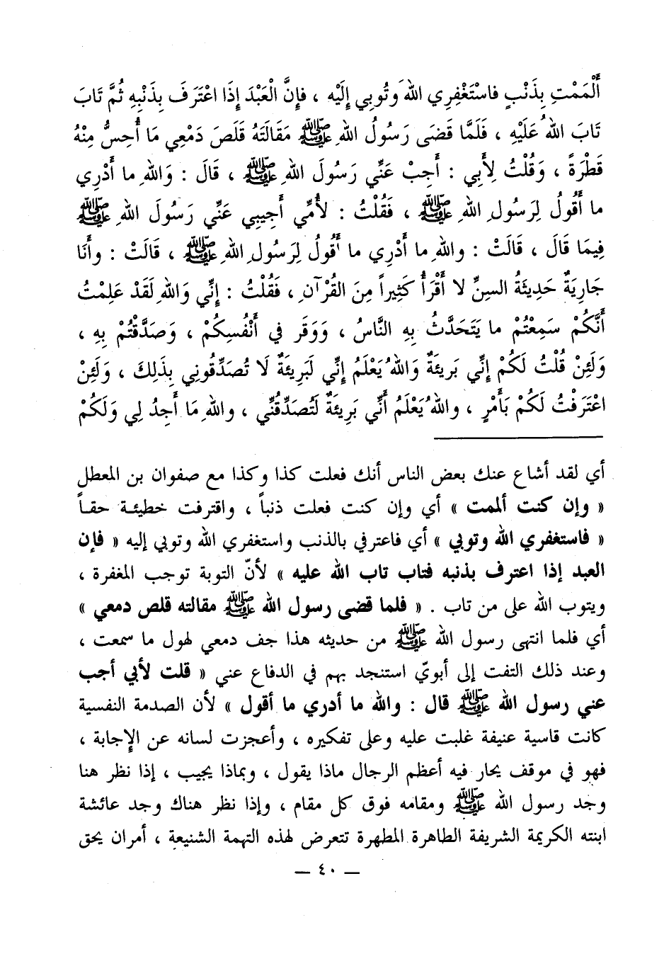 ألْمَمْتِ بِذَنْبٍ فاسْتَغْفِرِي اللهَ وتُوبِي إِلَيْه، فإِنَّ الْعَبْدَ إِذا اعْترفَ بِذَنْبِهِ ثُمَّ تَابَ تَابَ اللهُ عَلَيْهِ، فَلَمَّا قَضَى رَسُولُ اللهِ - صلى الله عليه وسلم - مَقَالَتَهُ قَلَصَ دَمْعِي مَا أُحِسُّ مِنْهُ قَطرةً، وَقُلْتُ لِأبِي: أجب عَنِّي رَسُولَ اللهِ - صلى الله عليه وسلم -، قَالَ: وَاللهِ ما أدْرِي ما أقُولُ لِرَسُولِ اللهِ - صلى الله عليه وسلم -، فَقُلْتُ: لأمي أجِيبِي عَنِّي رَسُولَ اللهِ - صلى الله عليه وسلم - فِيمَا قَالَ، قَالَتْ: واللهِ ما أدْرِي ما أقُولُ لِرَسُولِ اللهِ - صلى الله عليه وسلم -، قَالَتْ: وأنَا جَارِيَة حَدِيثَةُ السِنِّ لا أقْرَأ كَثِيراً مِنَ القُرآنِ، فَقُلْتُ: إِني وَاللهِ لَقَدْ عَلِمْتُ أنَّكُمْ سَمِعْتُمْ ما يَتَحَدَّثُ بِهِ النَّاسُ، وَوَقَر في أنْفُسِكُمْ، وَصَدَّقْتُمْ بِهِ، وَلَئِنْ قُلْتُ لَكُمْ إِني بَريئَة وَاللهُ يَعْلَمُ إِنِّي لَبَرِيئَة لَا تُصَدِّقُونِي بذَلِكَ، وَلَئِنْ اعْتَرَفْتُ لَكُمْ بَأمْر، واللهُ يَعْلَمُ أني بَرِيئَة لتصَدِّقُنِّي، واللهِ مَا أجَدُ لِي وَلَكُمْ
