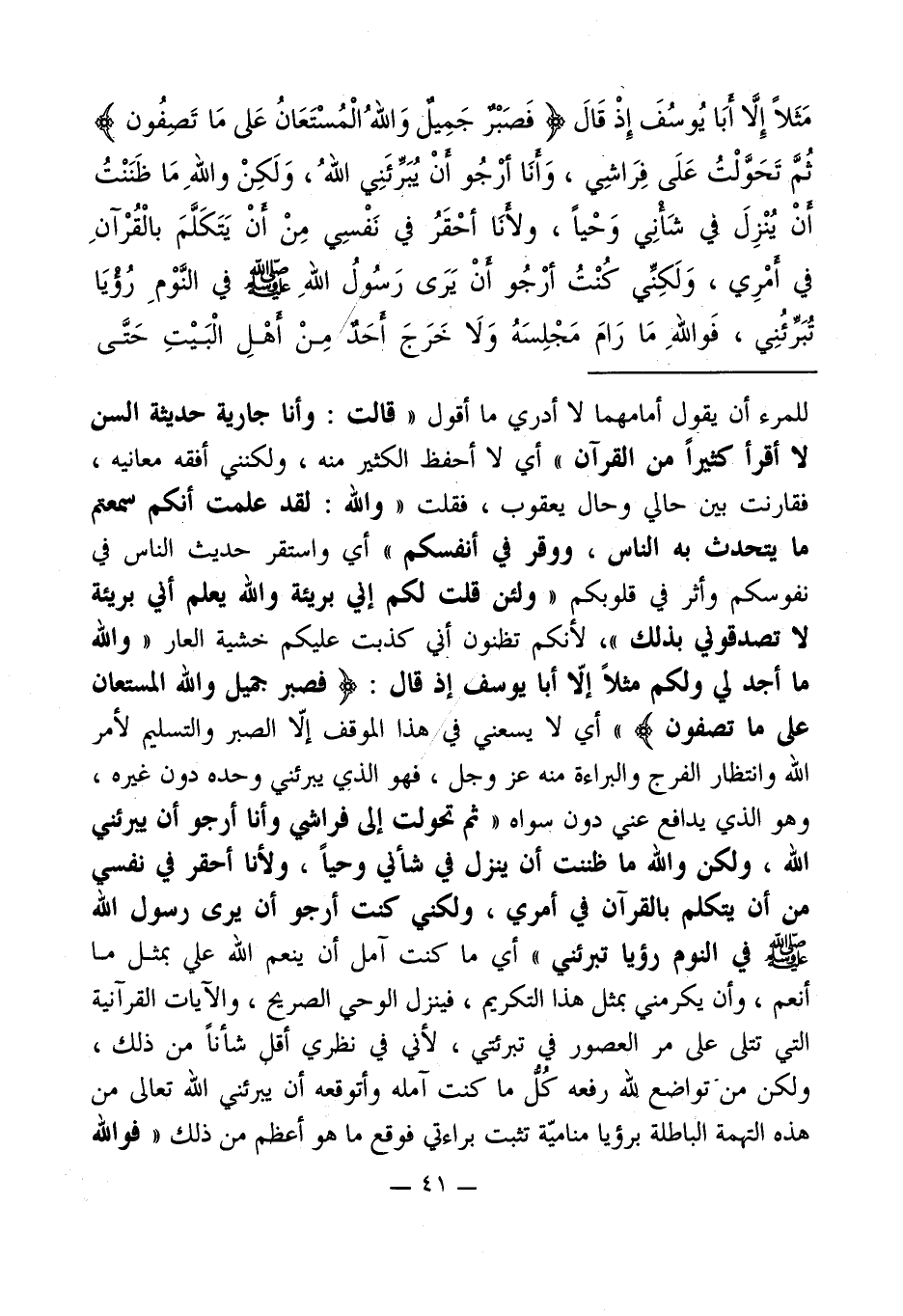 مَثَلاً إِلَّا أبَا يُوسُفَ إِذْ قَالَ (فَصَبْرٌ جَمِيلٌ وَاللَّهُ الْمُسْتَعَانُ عَلَى مَا تَصِفُونَ) ثُمَّ تَحَوَّلْتُ عَلَى فِرَاشِي، وَأنا أرجُو أن يُبَرِّئَنِي اللهُ، وَلَكِنْ واللهِ مَا ظَنَنْتُ أنْ يُنْزِلَ في شَأنِي وَحْياً، ولأنَا أحْقَرُ في نَفْسِي مِنْ أنْ يَتَكَلَّمَ بالْقُرْآنِ في أمْرِي، وَلَكِنِّي كُنْتُ أرْجُو أنْ يَرَى رَسُولُ اللهِ - صلى الله عليه وسلم - في النَّوْمِ رُؤيَا تُبَرِّئُنِي، فَوالله مَا رَامَ مَجْلِسَهُ وَلَا خَرَجَ أحَدٌ مِنْ أهْلِ الْبَيْتِ حَتَّى