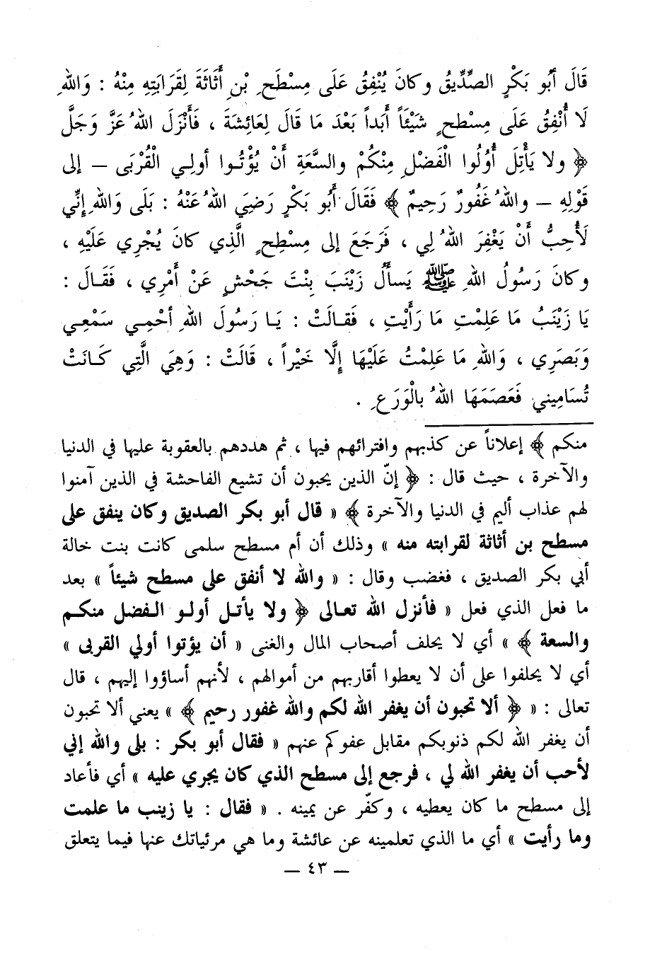 مِنْكُمْ) إعلاناً عن كذبهم وافترائهم فيها، ثم هددهم بالعقوبة عليها في الدنيا والآخرة، حيث قال: (إِنَّ الَّذِينَ يُحِبُّونَ أَنْ تَشِيعَ الْفَاحِشَةُ فِي الَّذِينَ آَمَنُوا لَهُمْ عَذَابٌ أَلِيمٌ فِي الدُّنْيَا وَالْآَخِرَةِ) " قال أبو بكر الصديق وكان ينفق على مسطح بن أثاثة لقرابته منه " وذلك أن أم مسطح سلمى كانت بنت خالة أبي بكر الصديق، فغضب وقال: " والله لا أنفق على مسطح شيئاً " بعد ما فعل الذي فعل " فأنزل الله تعالى (وَلَا يَأْتَلِ أُولُو الْفَضْلِ مِنْكُمْ وَالسَّعَةِ) " أي لا يحلف أصحاب المال والغنى " أن يؤتوا أولي القربى " أي لا يحلفوا على أن لا يعطوا أقاربهم من أموالهم، لأنهم أساؤوا إليهم، قال تعالى: " (أَلَا تُحِبُّونَ أَنْ يَغْفِرَ اللَّهُ لَكُمْ وَاللَّهُ غَفُورٌ رَحِيمٌ) " يعني ألا تحبون أن يغفر الله لكم ذنوبكم مقابل عفوكم عنهم " فقال أبو بكر: بلى والله إني لأحب أن يغفر الله لي، فرجع إلى مسطح الذي كان يجري عليه " أي فأعاد إلى مسطح ما كان يعطيه، وكفّر عن يمينه. " فقال: يا زينب ما علمت وما رأيت " أي ما الذي تعلمينه عن عائشة وما هي مرئياتك عنها فيما يتعلق
