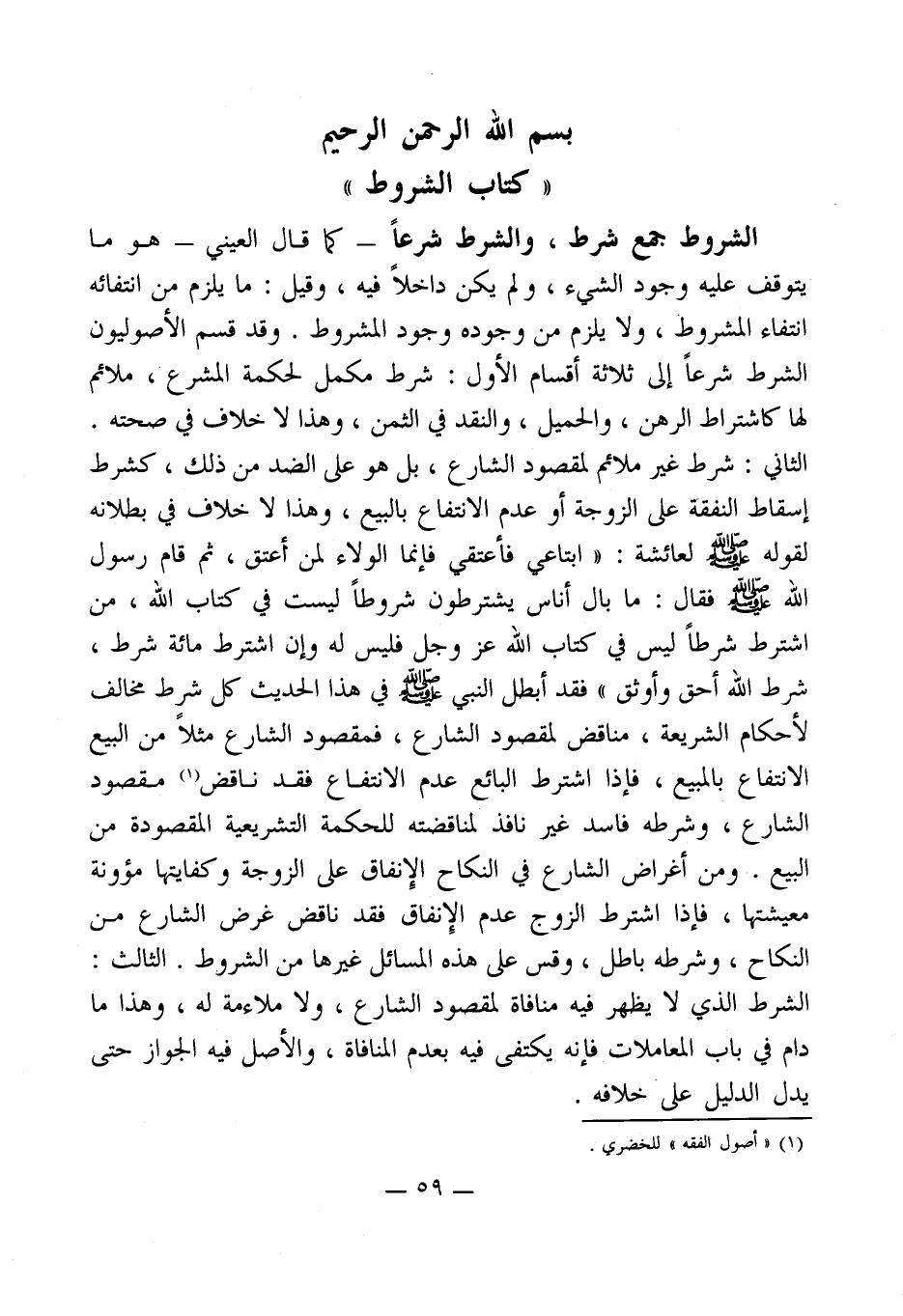الشروط جمع شرط، والشرط شرعاً -كما قال العيني- هو ما يتوقف عليه وجود الشيء، ولم يكن داخلاً فيه، وقيل: ما يلزم من انتفائه انتفاء المشروط، ولا يلزم من وجوده وجود المشروط. وقد قسم الأصوليون الشرط شرعاً إلى ثلاثة أقسام الأول: شرط مكمل لحكمة المشرع، ملائم لها كاشتراط الرهن، والحميل، والنقد في الثمن، وهذا لا خلاف في صحته.