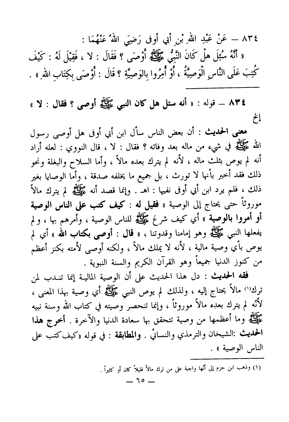 834 - قوله: " أنه سئل هل كان النبي - صلى الله عليه وسلم - أوصى؟ فقال: لا " إلخ معنى الحديث: أن بعض الناس سأل ابن أبي أوفى هل أوصى رسول الله - صلى الله عليه وسلم - في شيء من ماله بعد وفاته؟ فقال: لا، قال النووي: لعله أراد أنه لم يوص بثلث ماله، لأنه لم يترك بعده مالاً، وأما السلاح والبغلة ونحو ذلك فقد أخبر بأنها لا تورث، بل جميع ما يخلفه صدقة، وأما الوصايا بغير ذلك، فلم يرد ابن أبي أوفى نفيها: اهـ. وإنما قصد أنه - صلى الله عليه وسلم - لم يترك مالاً موروثاً حتى يحتاج إلى الوصية " فقيل له: كيف كتب على الناس الوصية أو أمروا بالوصية " أي كيف شرعَ - صلى الله عليه وسلم - للناس الوصية، وأمرهم بها، ولم يفعلها النبي - صلى الله عليه وسلم - وهو إمامنا وقدوتنا، " قال: أوصى بكتاب الله " أي لم يوص بأي وصية مالية، لأنه لا يملك مالاً، ولكنه أوصى لأمته بكنز أعظم من كنوز الدنيا جميعاً وهو القرآن الكريم والسنة النبوية.