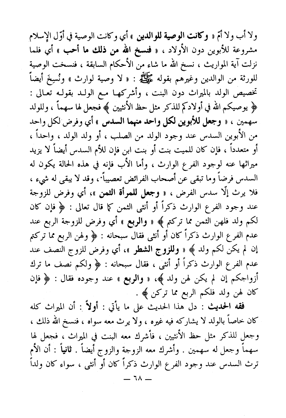 ولا أب ولا أمّ لا وكانت الوصية للوالدين " أي وكانت الوصية في أوّل الإِسلام مشروعة للأبوين دون الأولاد، " فنسخ الله من ذلك ما أحب " أي فلما نزلت آية المواريث، نسخ الله ما شاء من الأحكام السابقة، فنسخت الوصية للورثة من الوالدين وغيرهم بقوله - صلى الله عليه وسلم -: " لا وصية لوارث " ونُسِخَ أيضاً تخصيص الولد بالميراث دون البنت، وأشركها مع الولد بقوله تعالى: (يُوصِيكُمُ اللَّهُ فِي أَوْلَادِكُمْ لِلذَّكَرِ مِثْلُ حَظِّ الْأُنْثَيَيْنِ) فجعل لها سهماً، وللولد سهمين، " وجعل للأبوين لكل واحد منهما السدس " أي وفرض لكل واحد من الأبوين السدس عند وجود الولد من الصلب، أو ولد الولد، واحداً، أو متعدداً، فإن كان للميت بنت أو بنت ابن فإن للأم السدس أيضاً لا يزيد ميراثها عنه لوجود الفرع الوارث، وأما الأب فإنه في هذه الحالة يكون له السدس فرضاً وما تبقى عن أصحاب الفرائض تعصيباً، وقد لا يبقى له شيء، فلا يرث إلاّ سدس الفرض، " وجعل للمرأة الثمن " كما أي وفرض للزوجة عند وجود الفرع الوارث ذكراً أو أنثى الثمن كما قال تعالى: (فَإِنْ كَانَ لَكُمْ وَلَدٌ فَلَهُنَّ الثُّمُنُ مِمَّا تَرَكْتُمْ) " والربع " أي وفرض للزوجة الربع عند عدم الفرع الوارث ذكراً كان أو أنثى فقال سبحانه: (وَلَهُنَّ الرُّبُعُ مِمَّا تَرَكْتُمْ إِنْ لَمْ يَكُنْ لَكُمْ وَلَدٌ) " وللزوج الشطر "، أي وفرض للزوج النصف عند عدم الفرع الوارث ذكراً أو أنثى، فقال سبحانه: (وَلَكُمْ نِصْفُ مَا تَرَكَ أَزْوَاجُكُمْ إِنْ لَمْ يَكُنْ لَهُنَّ وَلَدٌ)، " والربع " عند وجوده فقال: (فَإِنْ كَانَ لَهُنَّ وَلَدٌ فَلَكُمُ الرُّبُعُ مِمَّا تَرَكْنَ).