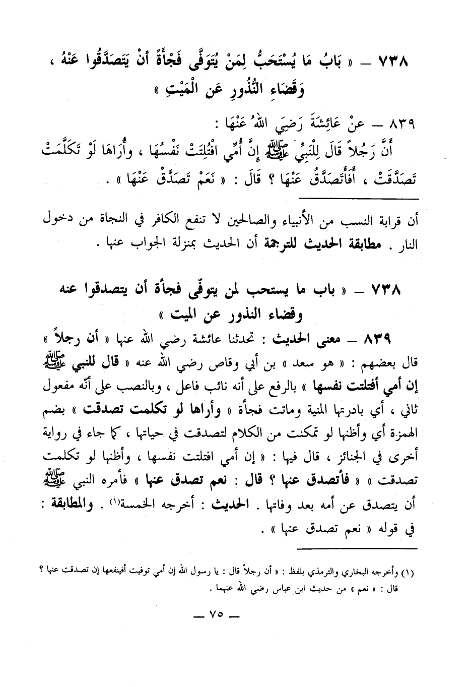 738 - " بَابُ مَا يُسْتَحَبُّ لِمَنْ يُتَوَفَّى فَجْأةً أنْ يَتَصَدَّقُوا عَنْهُ، وَقضَاءِ النُّذُورِ عَن الْمَيْتِ "