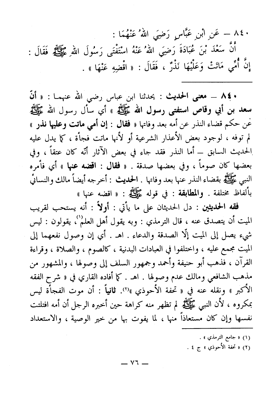 840 - معنى الحديث: يحدثنا ابن عباس رضي الله عنهما: " أنّ سعد بن أبي وقاص استفتى رسول الله - صلى الله عليه وسلم - " أي سأل رسول الله - صلى الله عليه وسلم - عن حكم قضاء النذر عن أمه بعد وفاتها " فقال: إن أمي ماتت وعليها نذر " لم توفه، لوجود بعض الأعذار الشرعية أو لأنها ماتت فجأة، كما يدل عليه الحديث السابق - أما النذر فقد جاء في بعض الآثار أنّه كان عتقاً، وفي بعضها كان صوماً، وفي بعضها صدقة. " فقال: اقضه عنها " أي فأمره النبي - صلى الله عليه وسلم - بقضاء النذر عنها بعد وفاتها. الحديث: أخرجه أيضاً مالك والنسائي بألفاظ مختلفة. والمطابقة: في قوله - صلى الله عليه وسلم -: " اقضه عنها ".