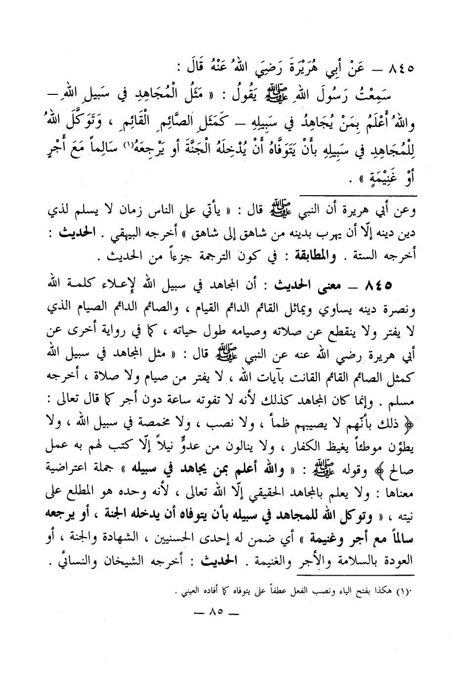 845 - معنى الحديث: أن المجاهد في سبيل الله لِإعلاء كلمة الله ونصرة دينه يساوي ويماثل القائم الدائم القيام، والصائم الدائم الصيام الذي لا يفتر ولا ينقطع عن صلاته وصيامه طول حياته، كما في رواية أخرى عن أبي هريرة رضي الله عنه عن النبي - صلى الله عليه وسلم - قال: " مثل المجاهد في سبيل الله كمثل الصائم القائم القانت بآيات الله، لا يفتر من صيام ولا صلاة، أخرجه مسلم. وإنما كان المجاهد كذلك لأنه لا تفوته ساعة دون أجر كما قال تعالى: (ذَلِكَ بِأَنَّهُمْ لَا يُصِيبُهُمْ ظَمَأٌ وَلَا نَصَبٌ وَلَا مَخْمَصَةٌ فِي سَبِيلِ اللَّهِ وَلَا يَطَئُونَ مَوْطِئًا يَغِيظُ الْكُفَّارَ وَلَا يَنَالُونَ مِنْ عَدُوٍّ نَيْلًا إِلَّا كُتِبَ لَهُمْ بِهِ عَمَلٌ صَالِحٌ) وقوله - صلى الله عليه وسلم -: " والله أعلم بمن يجاهد في سبيله " جملة اعتراضية معناها: ولا يعلم بالمجاهد الحقيقي إلاّ الله تعالى، لأنه وحده هو المطلع على نيته، " وتوكل الله للمجاهد في سبيله بأن يتوفاه أن يدخله الجنة، أو يرجعه سالماً مع أجر وغنيمة " أي ضمن له إحدى الحسنيين، الشهادة والجنة، أو العودة بالسلامة والأجر والغنيمة. الحديث: أخرجه الشيخان والنسائي.