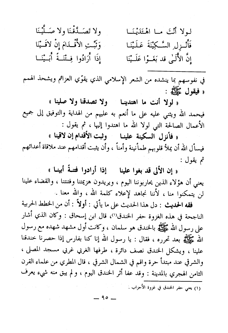 في نفوسهم بما ينشده من الشعر الإِسلامي الذي يقوّي العزائم ويشحذ الهمم "فيقول - صلى الله عليه وسلم -: