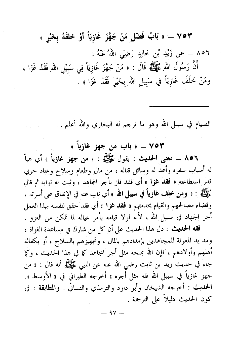 753 - " بَابُ فضلِ مَنْ جَهَّزَ غَازِيَاً أوْ خلفَهُ بِخيْرٍ "