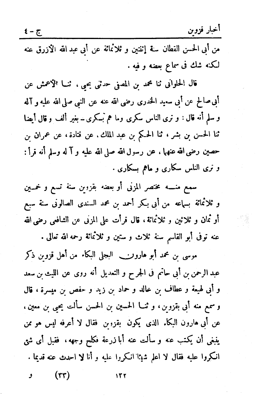 قَالَ الحلواني ثنا مُحَمَّدُ بْنُ الْمُصَفَّى حَدَّثَنِي يَحْيَى ثنا الأَعْمَشُ عَنْ أَبِي صَالِحٍ عن أبي سعيد الخدري رضي اللَّه عنه عن النبي صَلَّى اللَّهُ عَلَيْهِ وَآلِهِ وَسَلَّمَ أَنَّهُ قَالَ: "وَتَرَى النَّاسَ سُكَارَى وَمَا هم بسكارى" - بِغَيْرِ أَلِفٍ وَقَالَ أَيْضًا ثنا الْحَسَنُ بْنُ بِشْرٍ ثنا الْحَكَمُ بْنُ عَبْدِ الْمَلِكِ عَنْ قَتَادَةَ عَنْ عِمْرَانَ بْنِ حُصَيْنٍ رَضِيَ اللَّهُ عَنْهُمَا عَنْ رَسُولِ اللَّهِ صَلَّى اللَّهُ عَلَيْهِ وَآلِهِ وَسَلَّمَ أَنَّهُ قَرَأَ: {وَتَرَى النَّاسَ سُكَارَى وَمَا هُمْ بِسُكَارَى} .