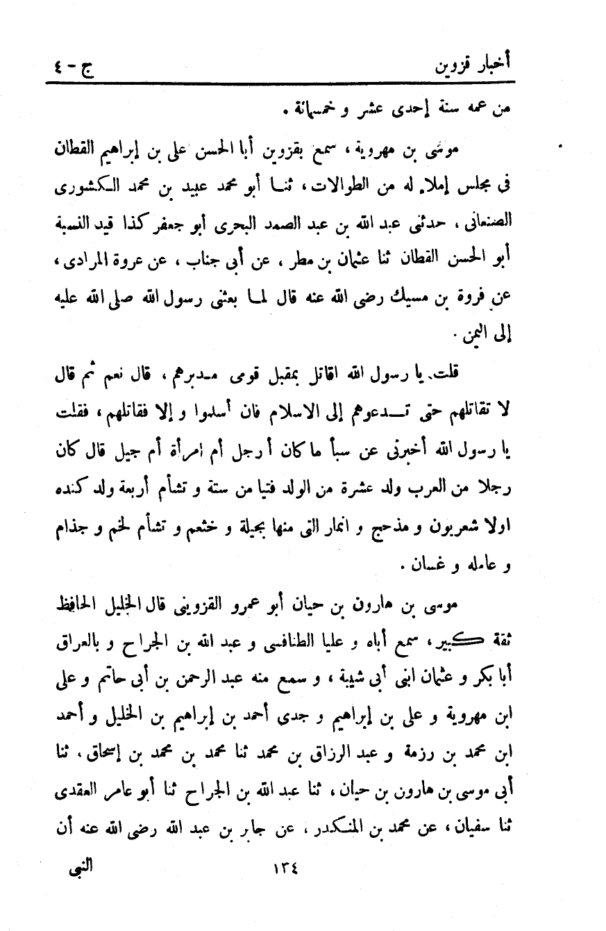 مُوسَى بْنُ مَهْرَوَيْهِ سَمِعَ بِقَزْوِينَ أَبَا الْحَسَنِ عَلِيَّ بْنَ إبراهيم الْقَطَّانُ فِي مَجْلِسٍ إِمْلاءً لَهُ مِنَ الطُّوَالاتِ ثنا أَبُو مُحَمَّدٍ عُبَيْدُ بْنُ مُحَمَّدٍ الْكَشْوَرِيُّ الصَّنْعَانِيُّ حَدَّثَنِي عَبْدُ اللَّهِ بْنُ عَبْدِ الصَّمَدِ الْبَحْرِيُّ أَبُو جَعْفَرٍ كَذَا قَيَّدَ النِّسْبَةَ أَبُو الْحَسَنِ الْقَطَّانُ ثنا عُثْمَانُ بْنُ مَطَرٍ عَنْ أَبِي جَنَابٍ عَنْ عُرْوَةَ الْمُرَادِيِّ عَنْ فَرْوَةَ بْنِ مُسَيْكٍ رَضِيَ الله عنه قال لما بَعَثَنِي رَسُولُ اللَّهِ صَلَّى اللَّهُ عليه وآله وَسَلَّمَ إِلَى الْيَمَنِ.