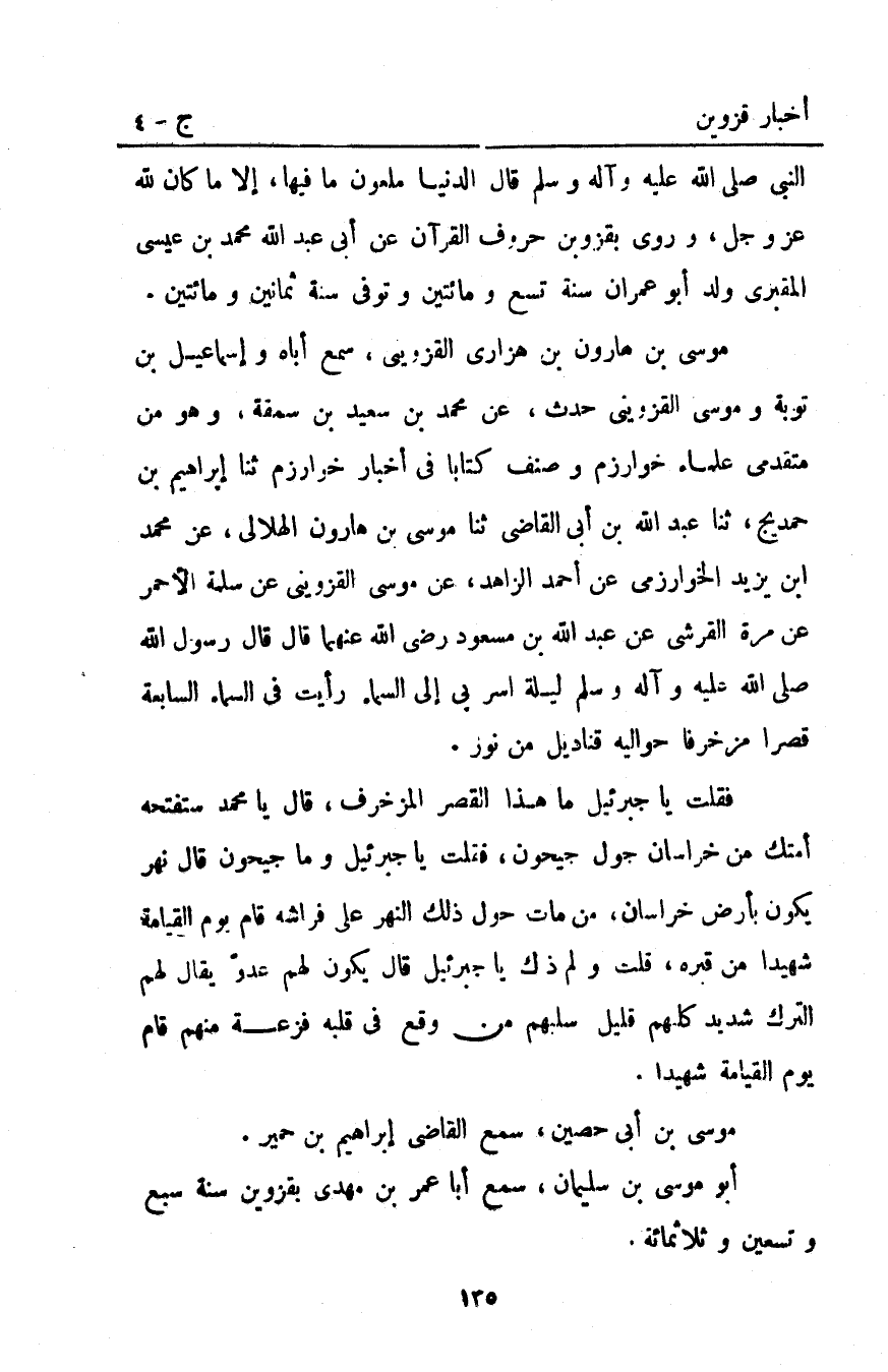 مُوسَى بْن هارون بْن هزارى القزويني سَمِعَ أَبَاهُ وَإِسْمَاعِيل بْنَ تَوْبَةَ وَمُوسَى الْقَزْوِينِيُّ حَدَّثَ عَنْ مُحَمَّدِ بن سعيد ين سمقَةَ وَهُوَ مِنْ مُتَقَدِّمِي عُلَمَاءِ خَوَارِزْمَ وَصَنَّفَ كِتَابًا فِي أَخْبَارِ خَوَارِزْمَ ثنا إبراهيم بْنُ حمديجَ ثنا عَبْدُ اللَّهِ بْنُ أَبِي الْقَاضِي ثنا مُوسَى بْنُ هَارُونَ الهلالي عن محمد ابن يَزِيدَ الْخُوَارَزْمِيِّ عَنْ أَحْمَد الزَّاهِدِ عَنْ مُوسَى الْقَزْوِينِيِّ عَنْ سَلَمَةَ الأَحْمَرِ عَنْ مُرَّةَ الْقُرَشِيِّ عَنْ عَبْدِ اللَّهِ بْنِ مَسْعُودٍ رَضِيَ اللَّهُ عَنْهُمَا قَالَ قَالَ رَسُولُ اللَّهِ صَلَّى اللَّهُ عَلَيْهِ وَآلِهِ وسلم: "اسر بِي إِلَى السَّمَاءِ رَأَيْتُ فِي السَّمَاءِ السَّابِعَةِ قَصْرًا مُزَخْرَفًا حَوَالَيْهِ قَنَادِيلُ مِنْ نُورٍ".